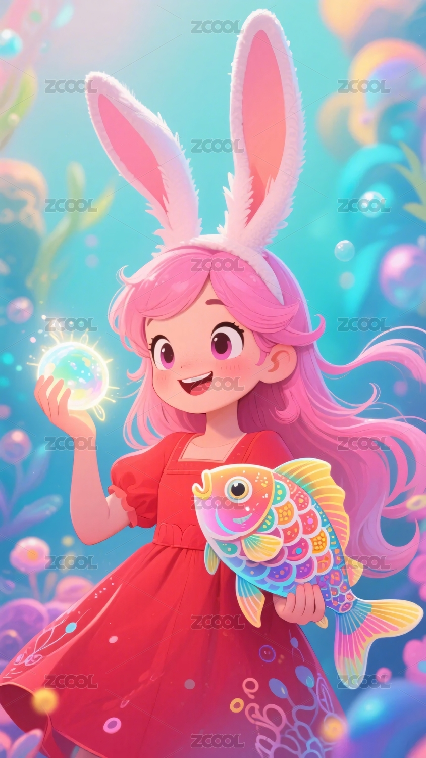 持魚粉發(fā)兔耳女孩奇幻插畫