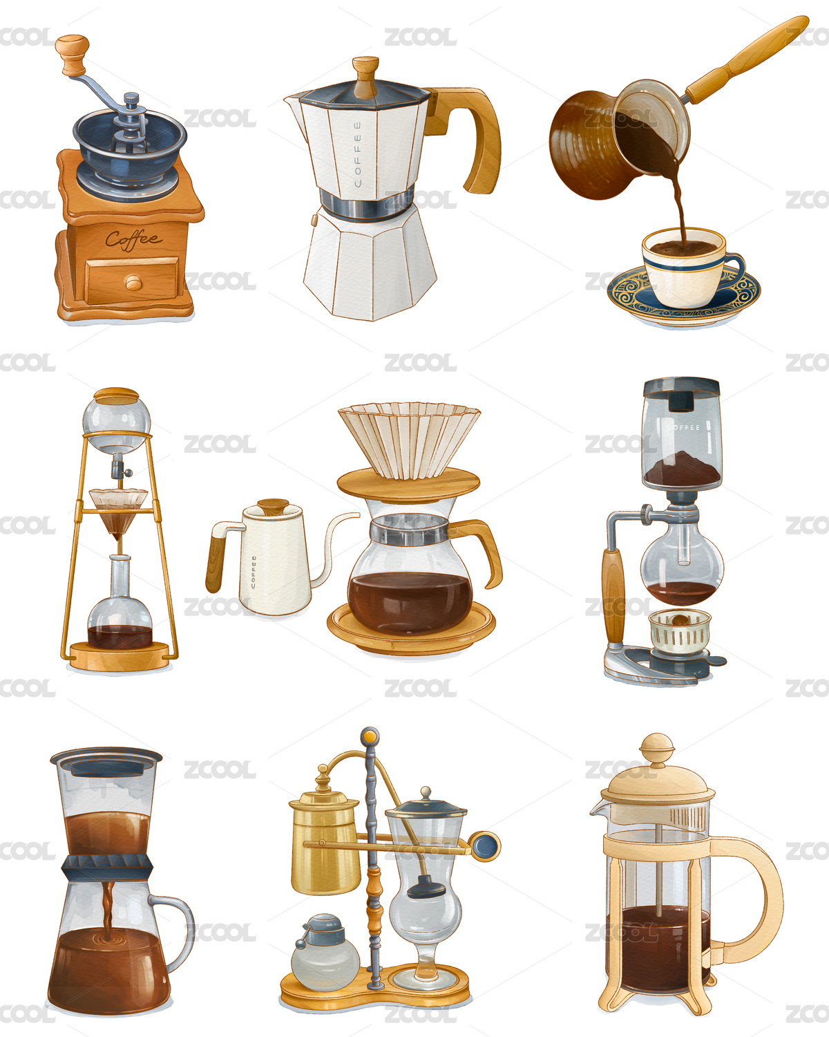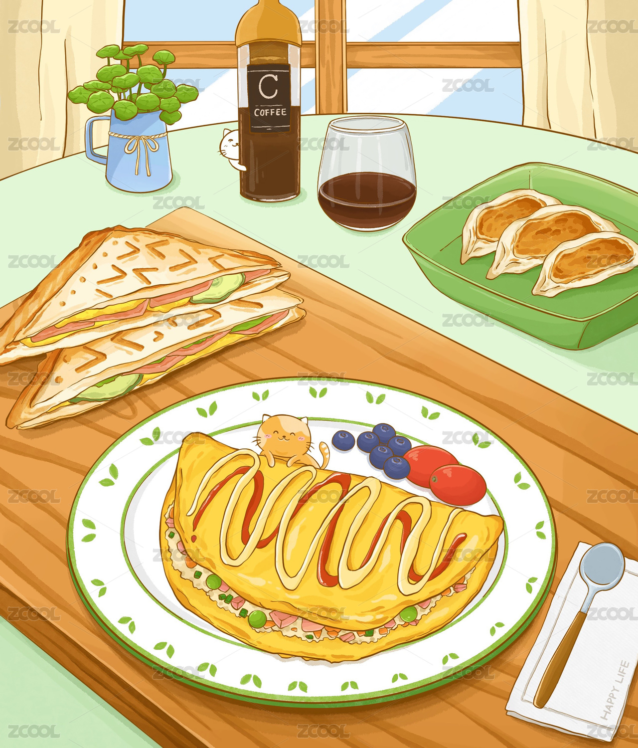 早餐插畫手繪蛋包飯飛碟吐司煎餃冷萃咖啡