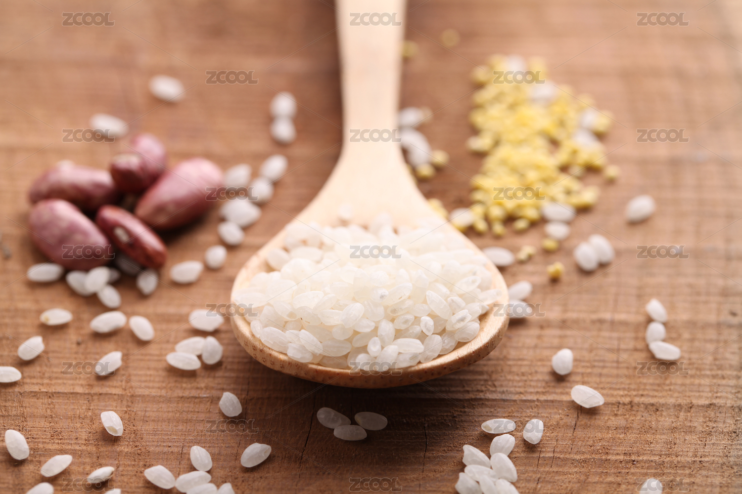 棕色木紋桌上放著一些大米和木勺