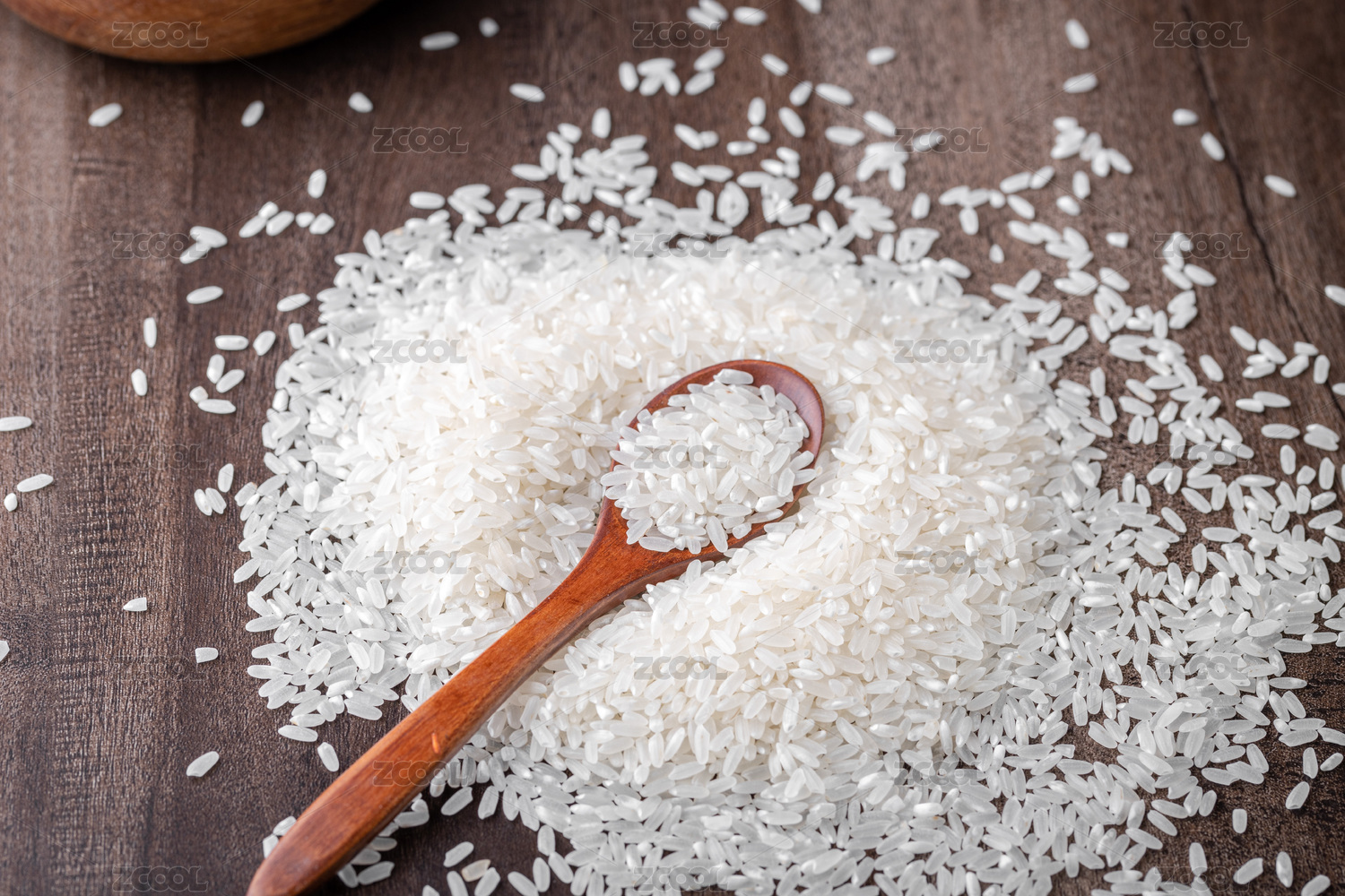 深色背景下檀木碗中的生白米