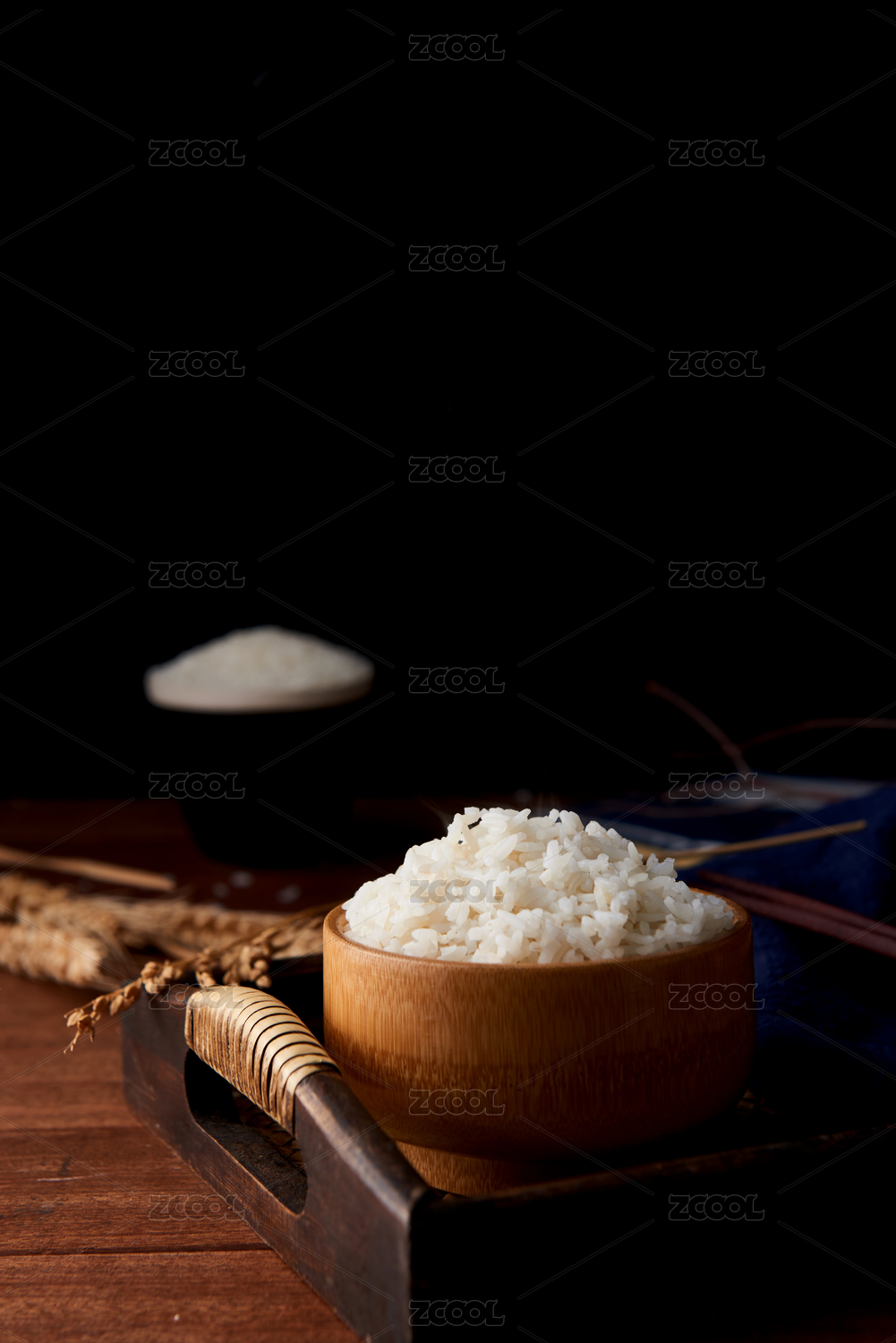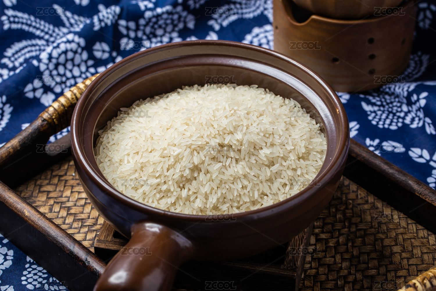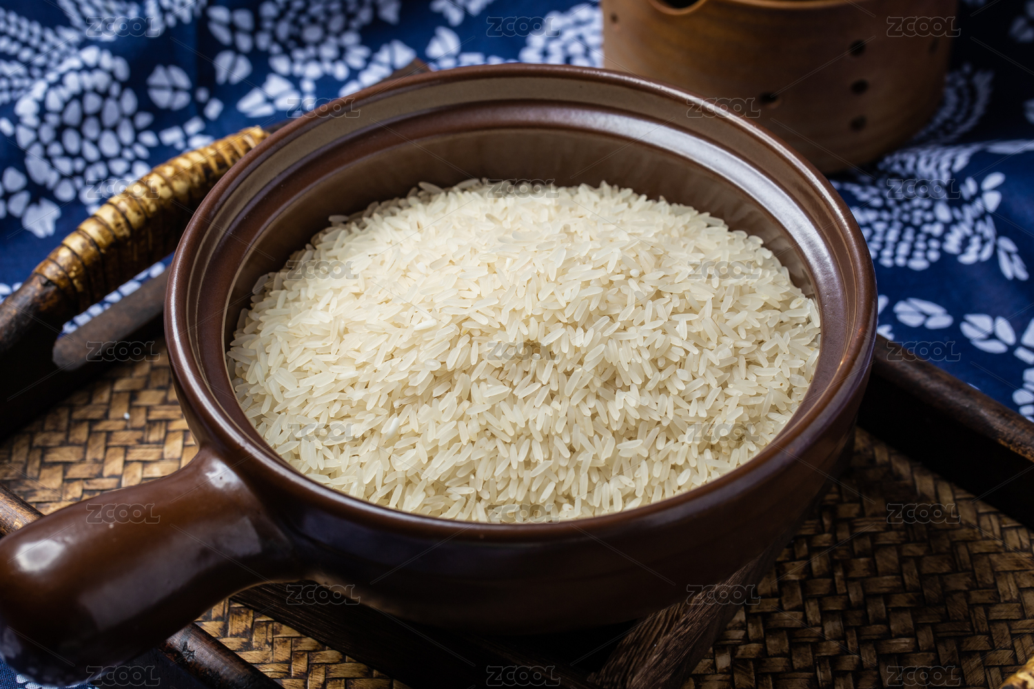 棕色調(diào)背景下竹編簍盤里的生白米飯