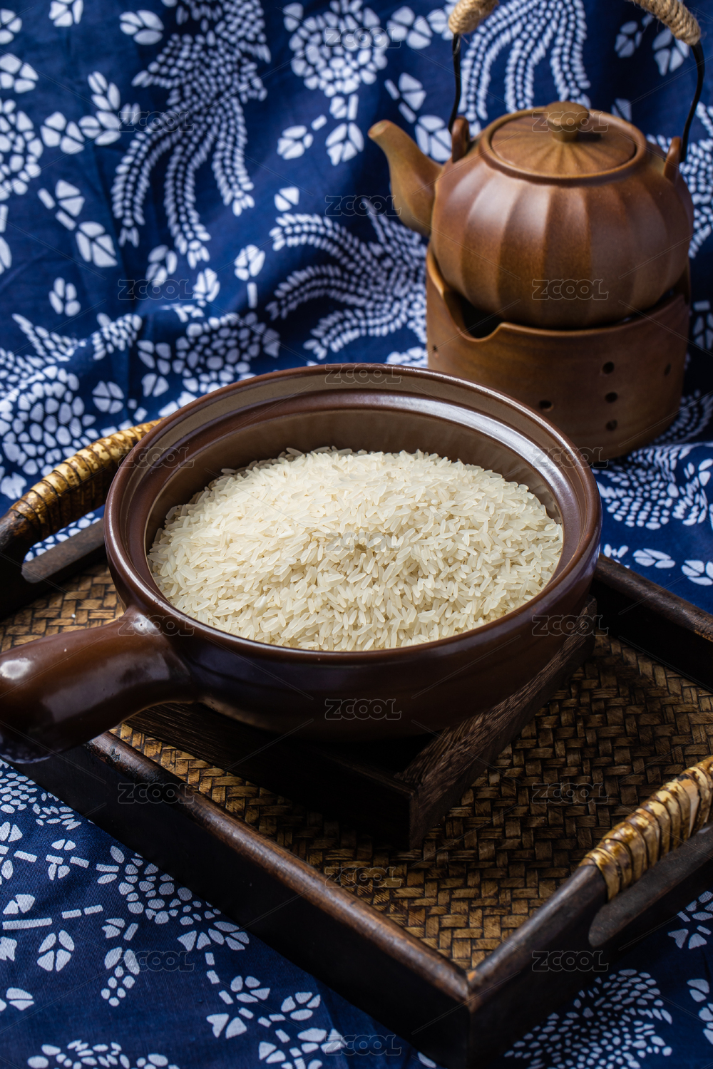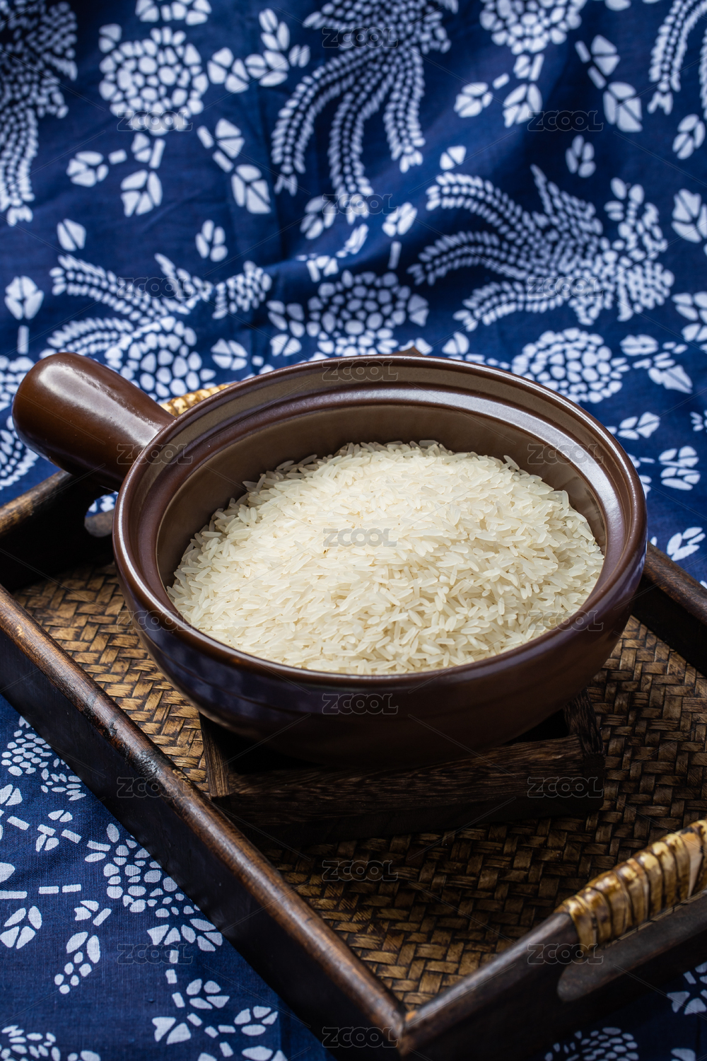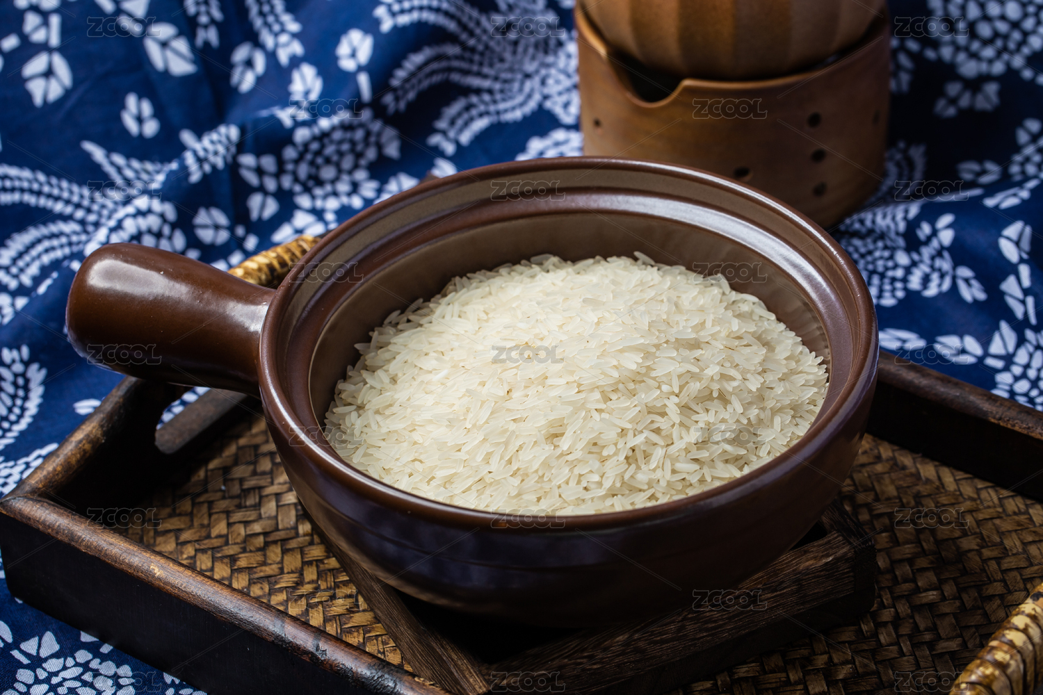 棕色調(diào)背景下竹編簍盤里的生白米飯