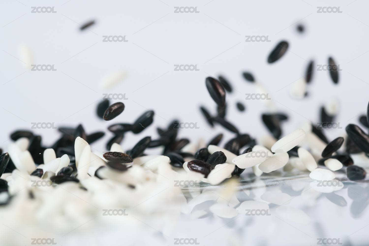 黑米和白米掉落白色背景瞬間高速抓拍