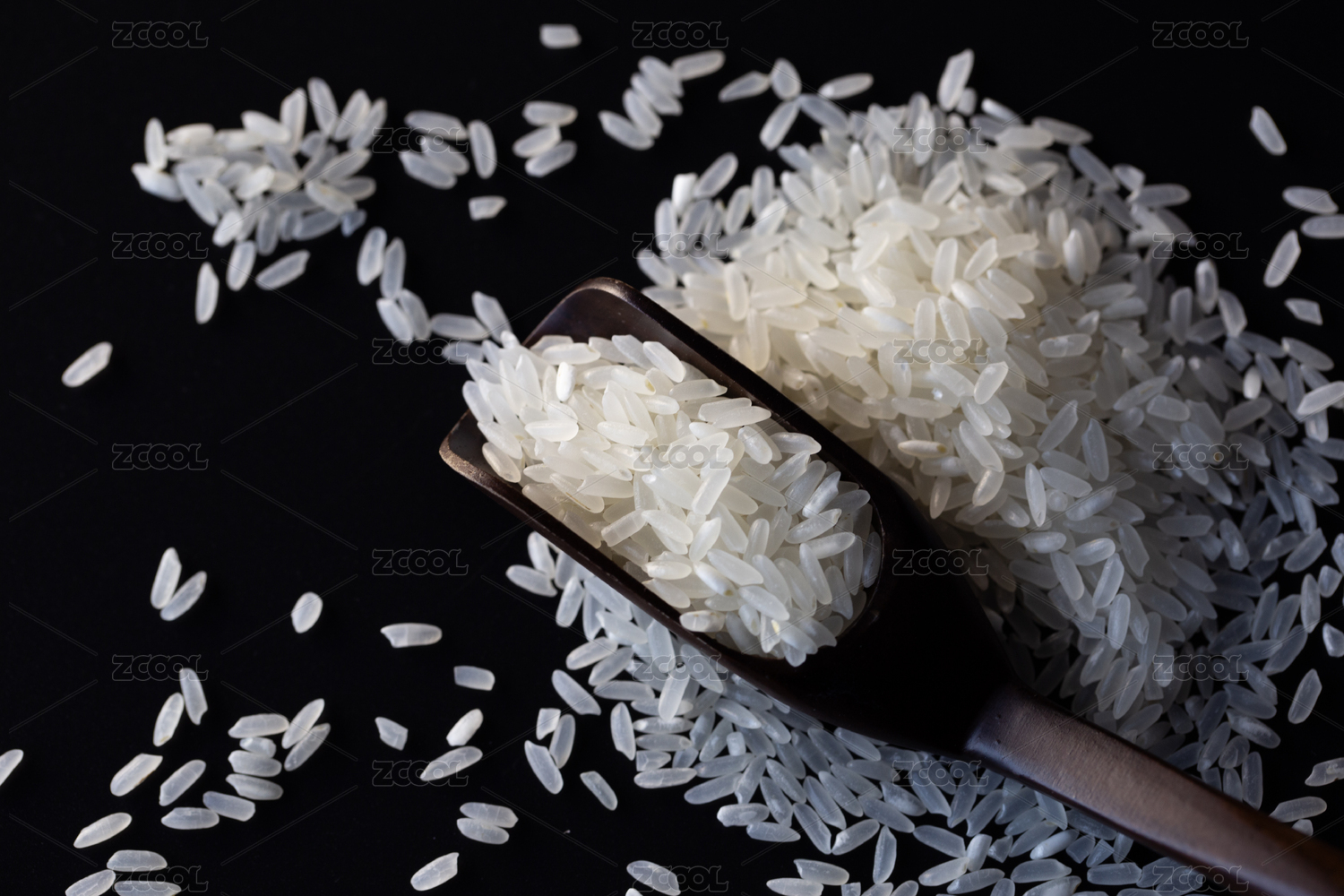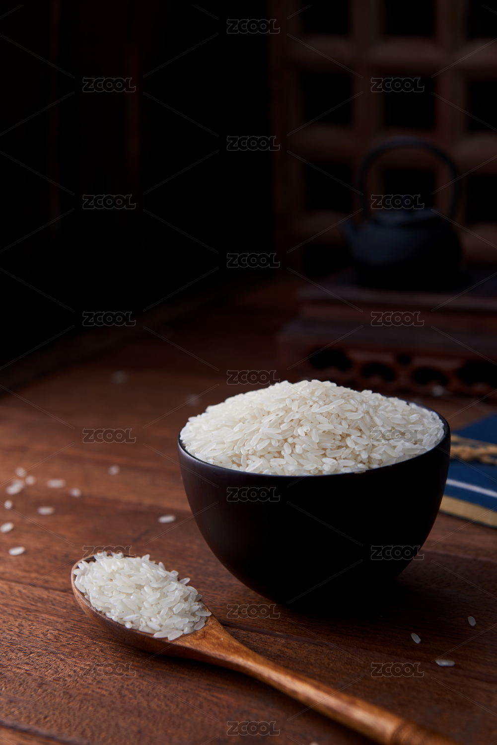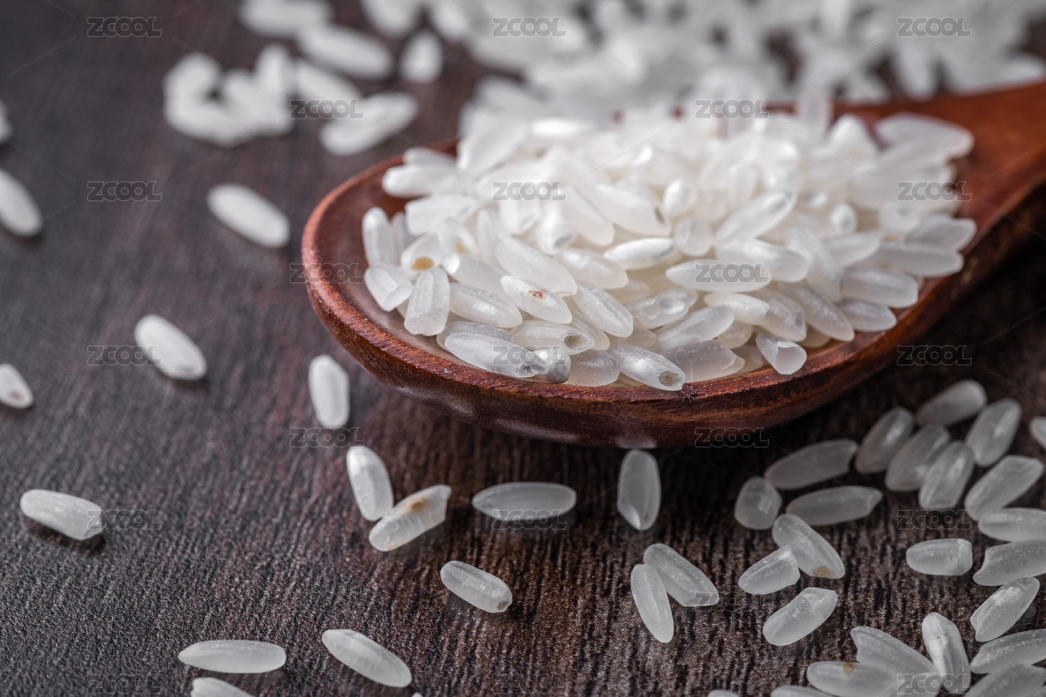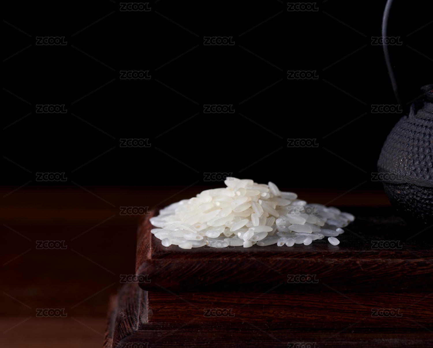 深色背景下檀木上的生白米