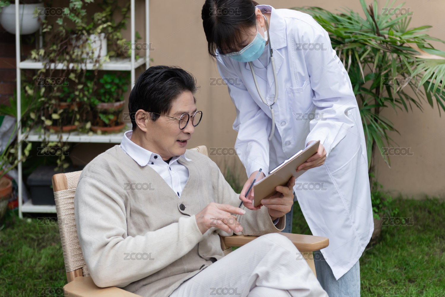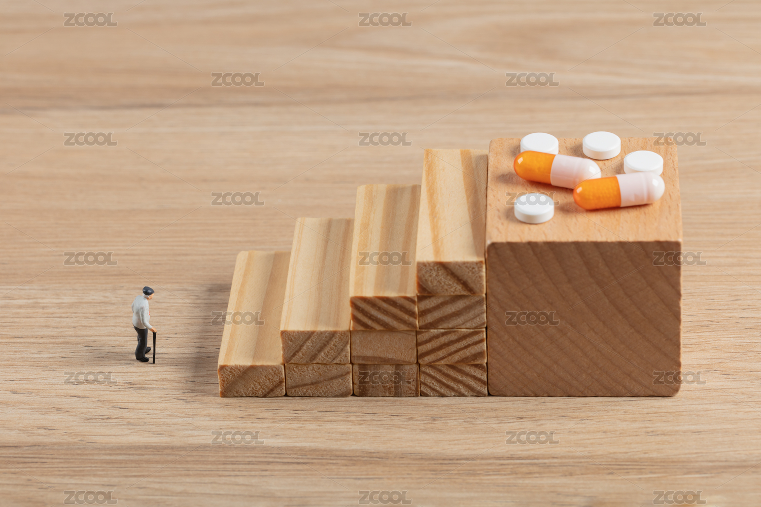 微縮創(chuàng)意臺階原木色上階梯的老年人與膠囊藥