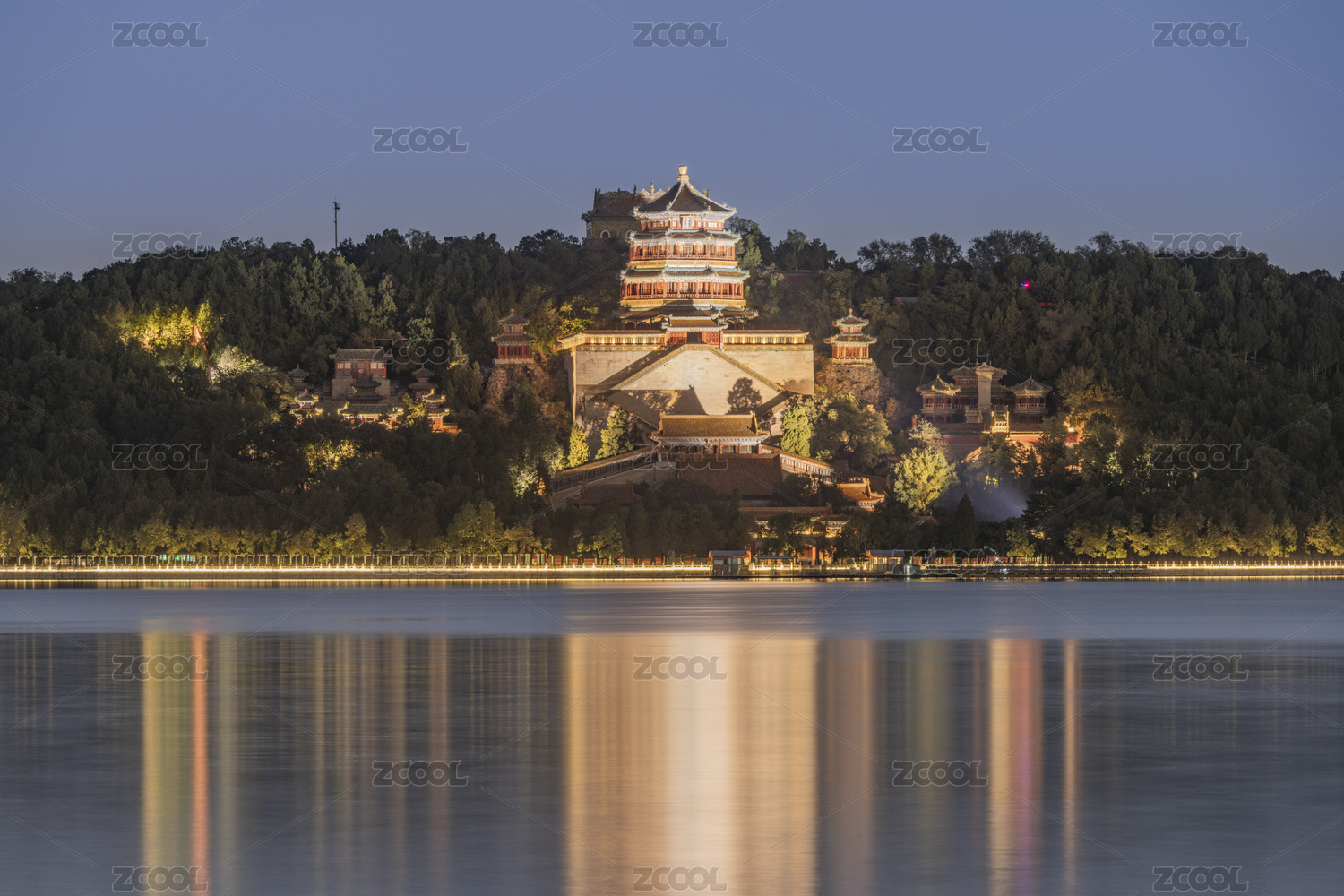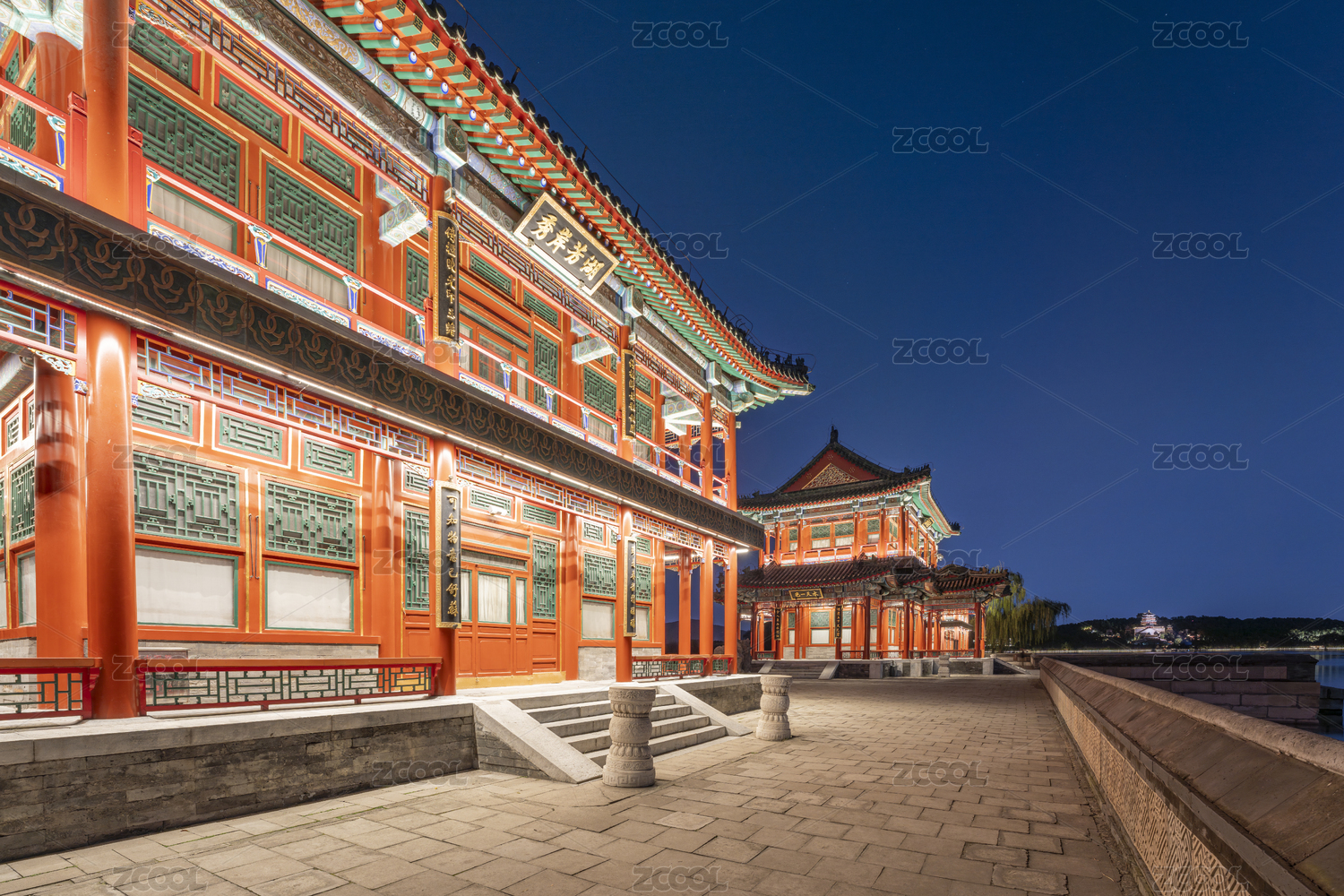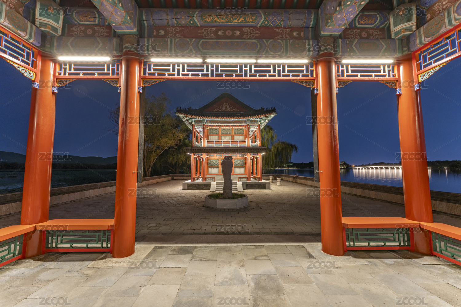 北京頤和園古建筑夜晚燈光