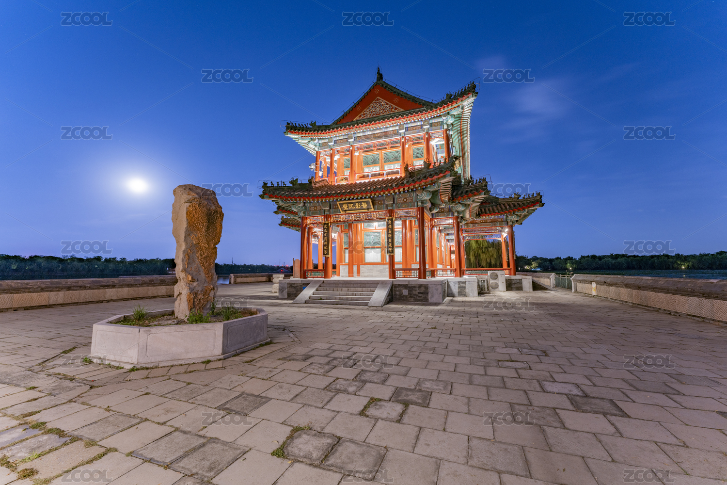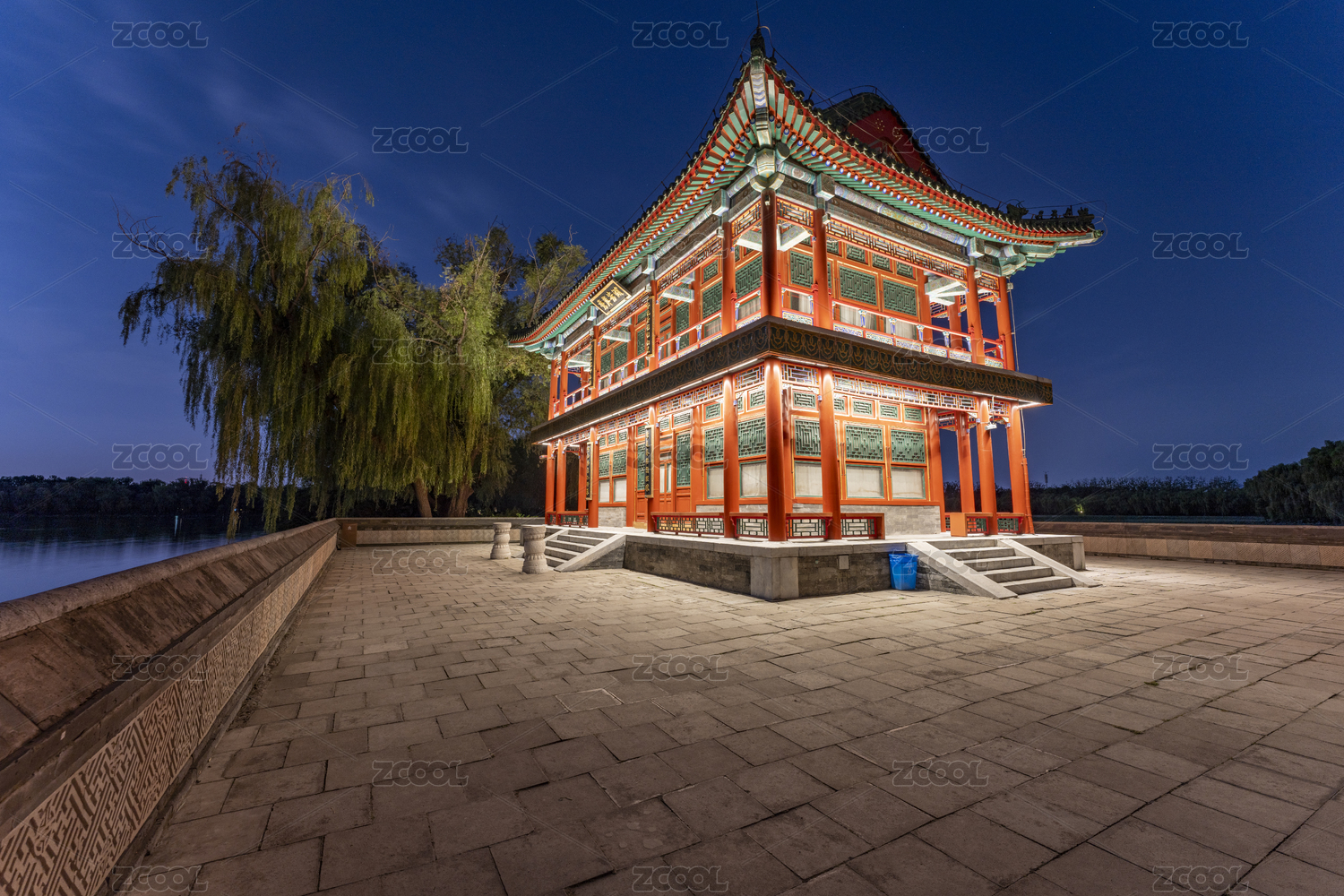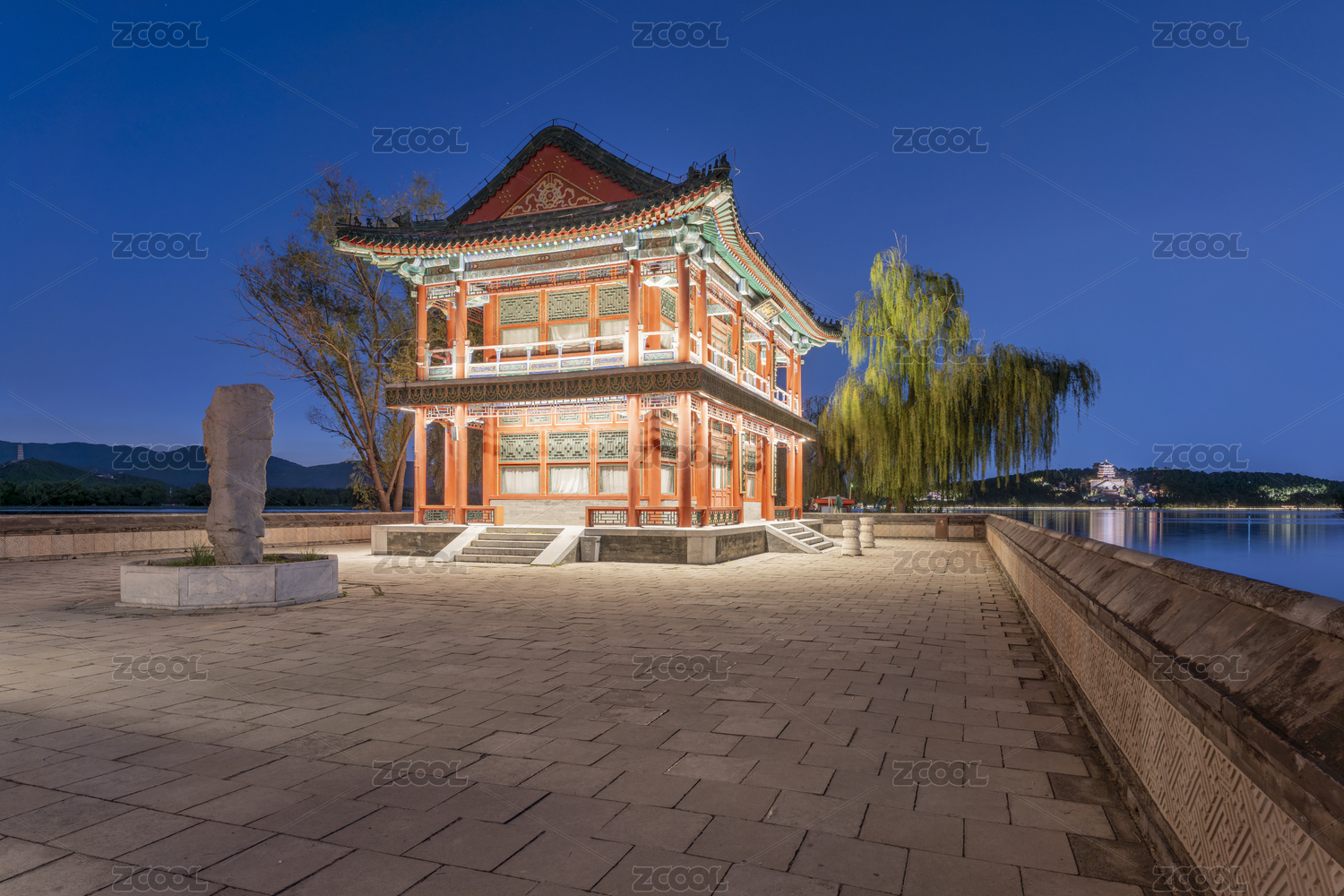 北京頤和園古建筑夜晚燈光