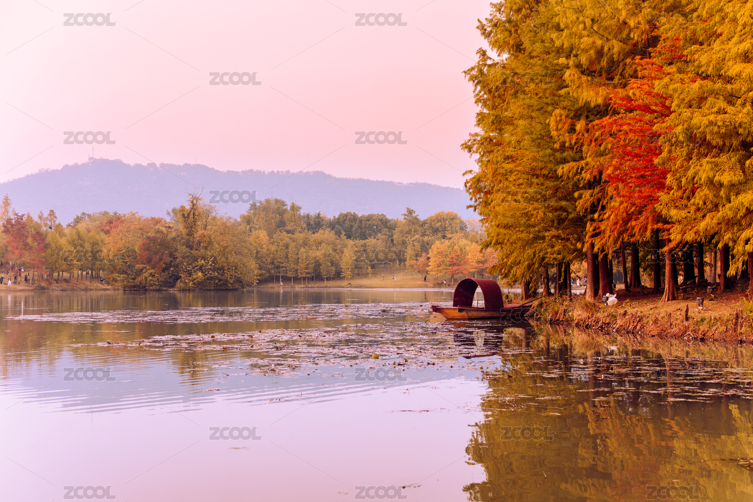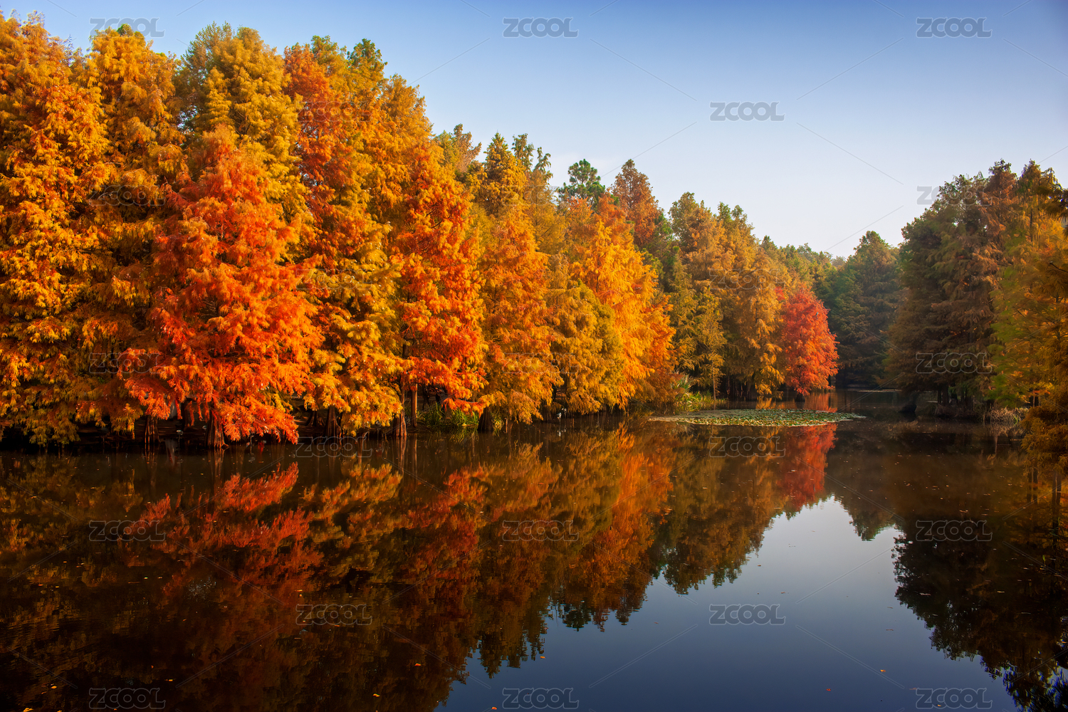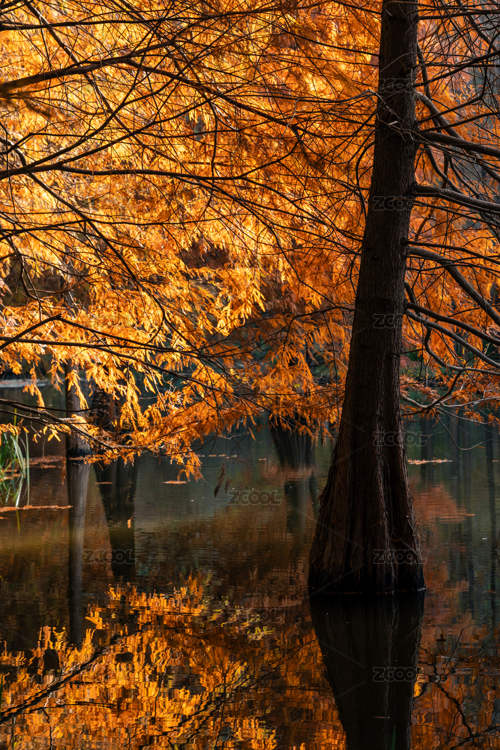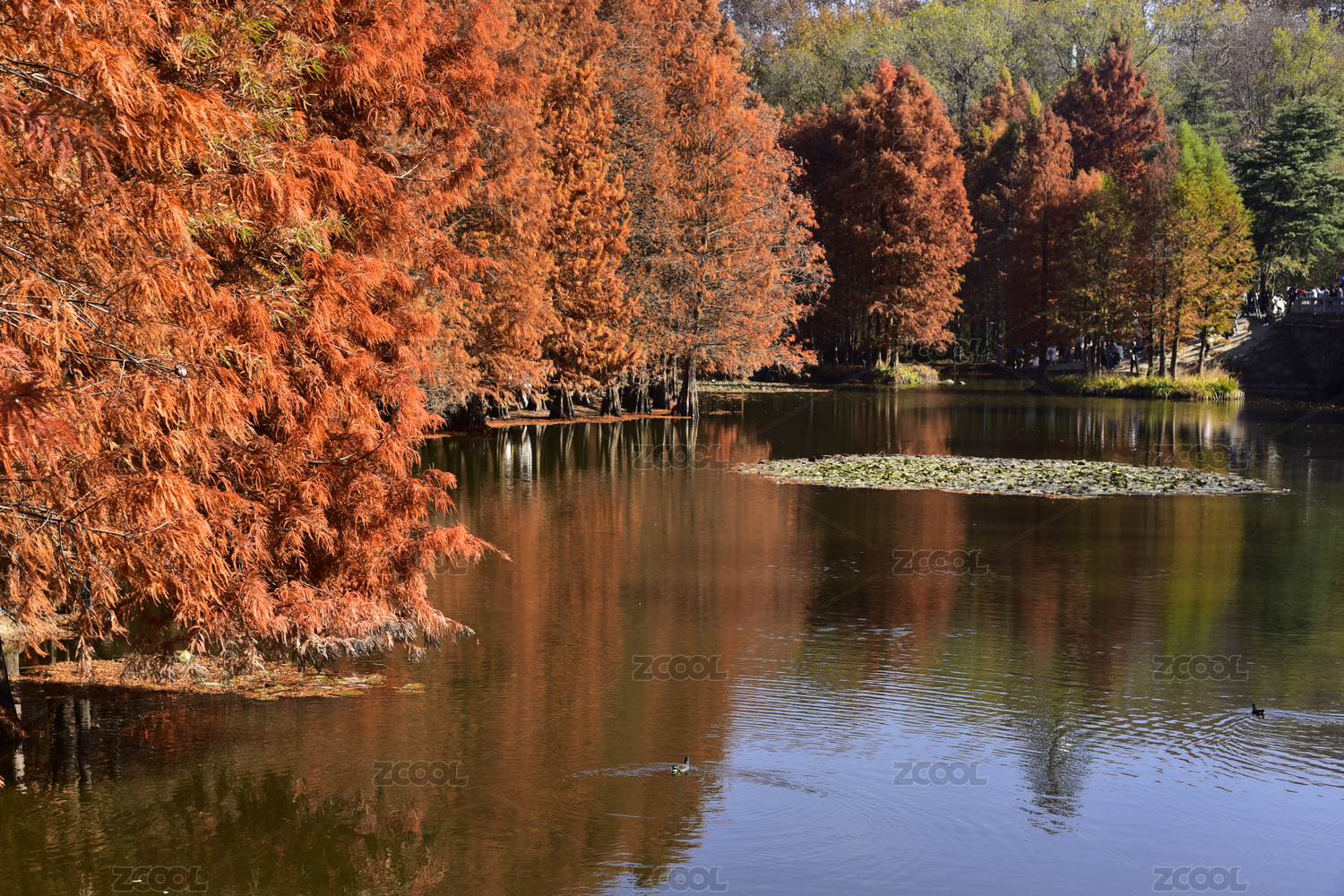 南京燕雀湖秋季紅色的落羽杉和倒影