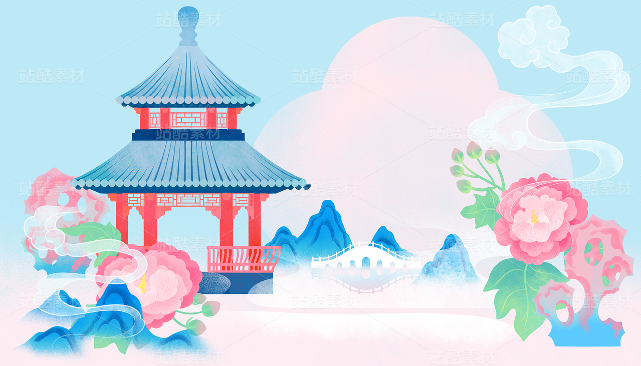 八月處暑亭子芙蓉花山石祥云小橋國(guó)風(fēng)插畫(huà)