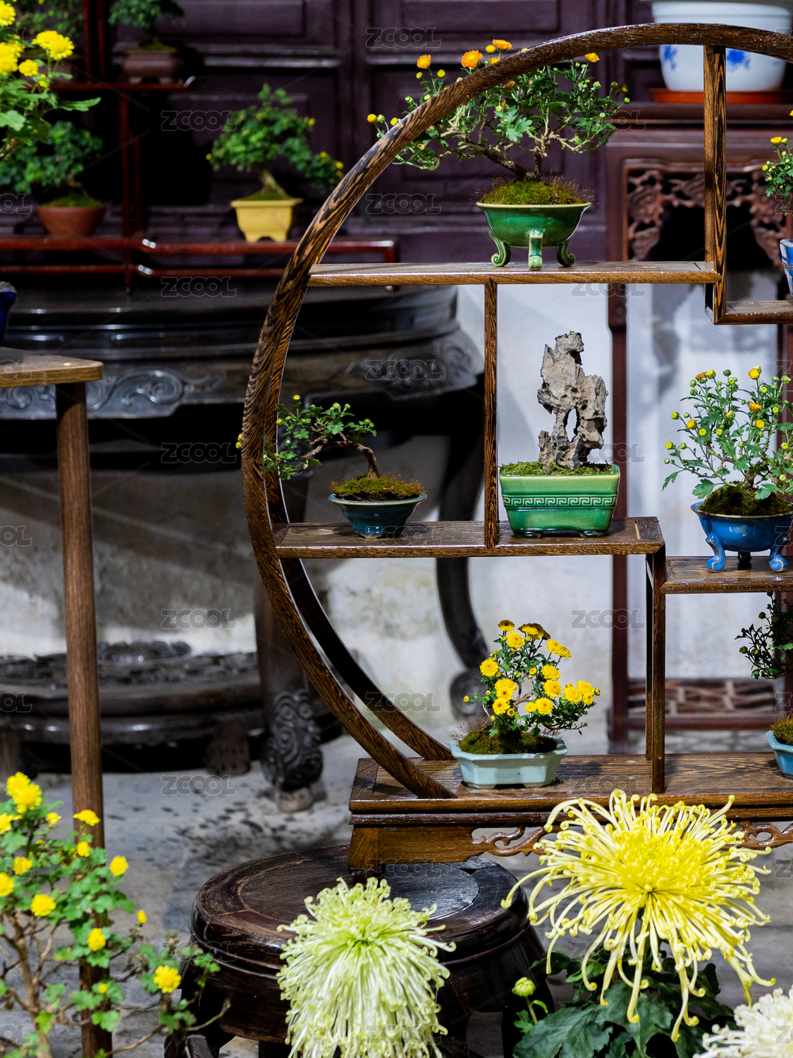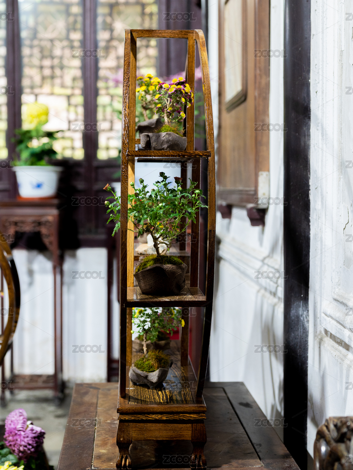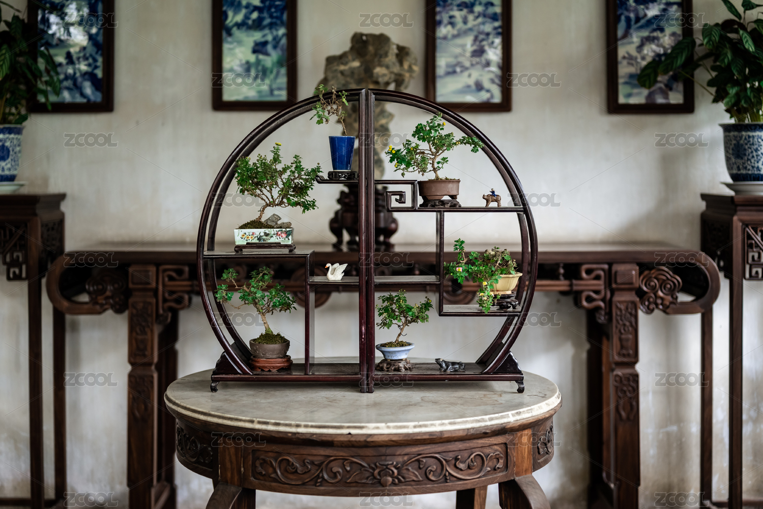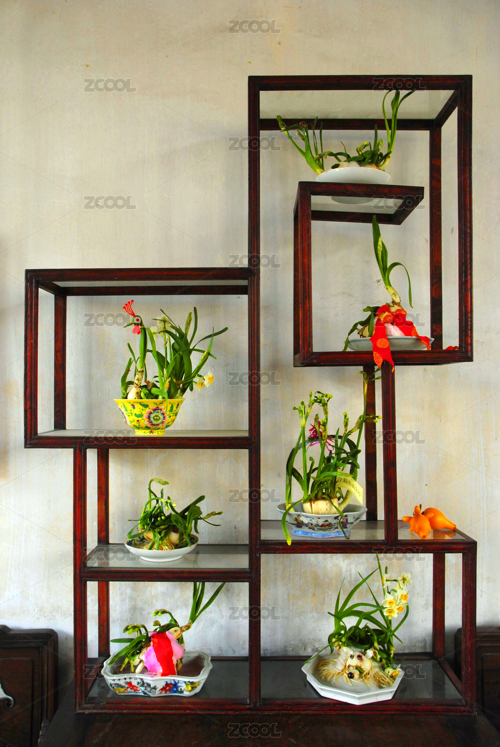 中國(guó)蘇州園林留園 室內(nèi)博古架水仙花盆景