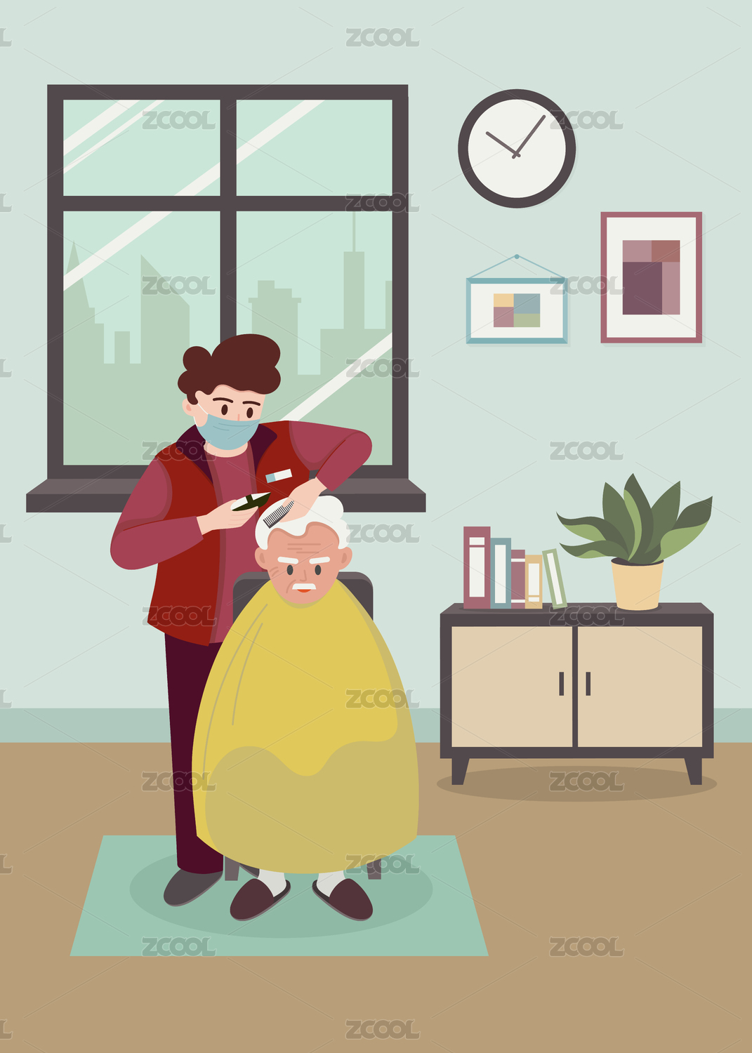 工作人員上門為老人理發(fā)插畫