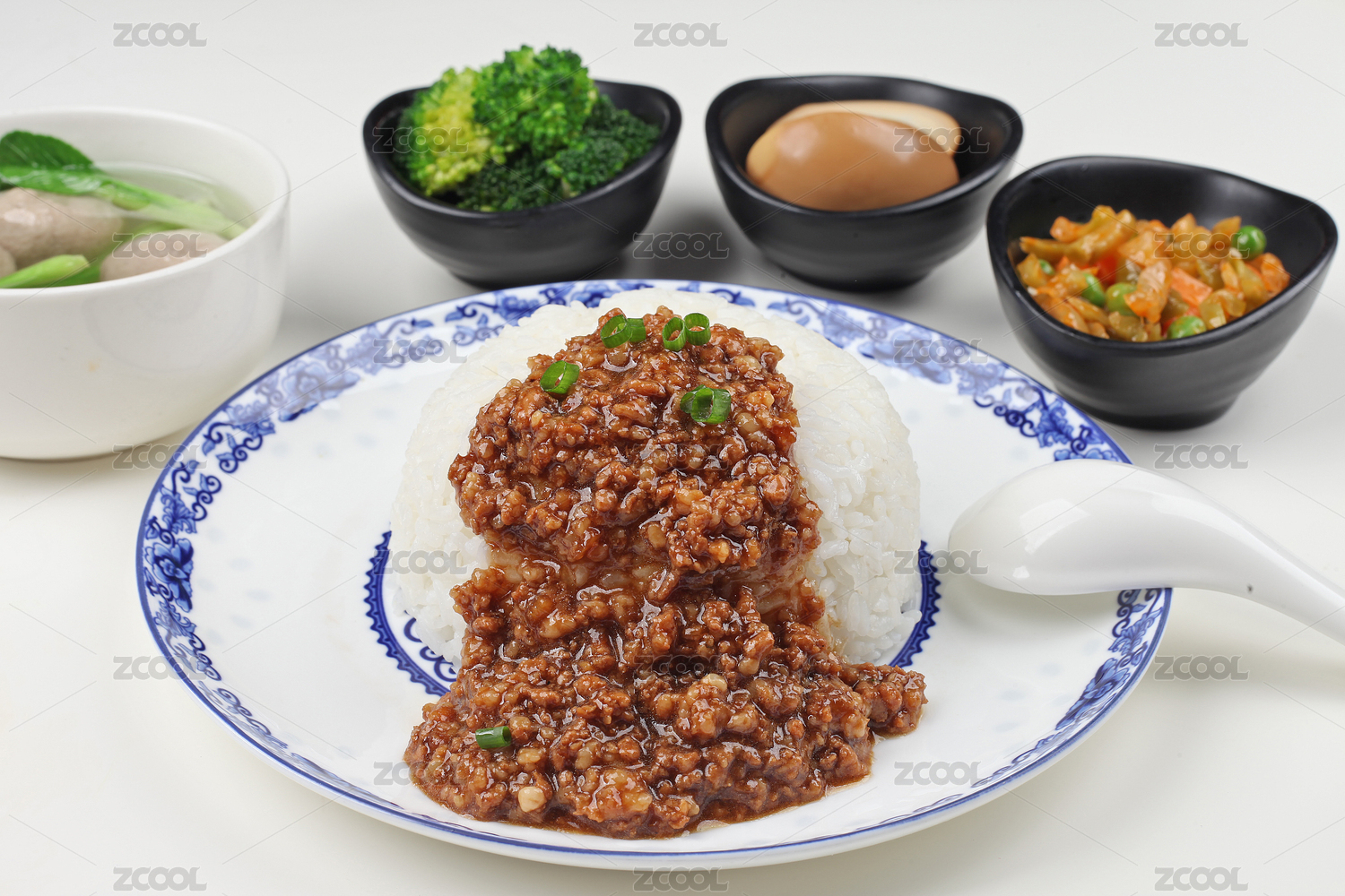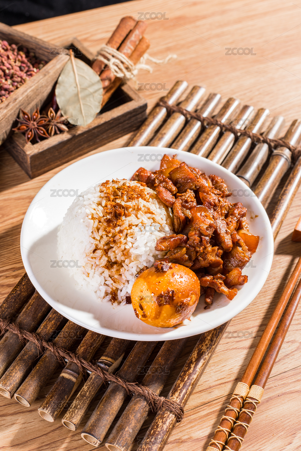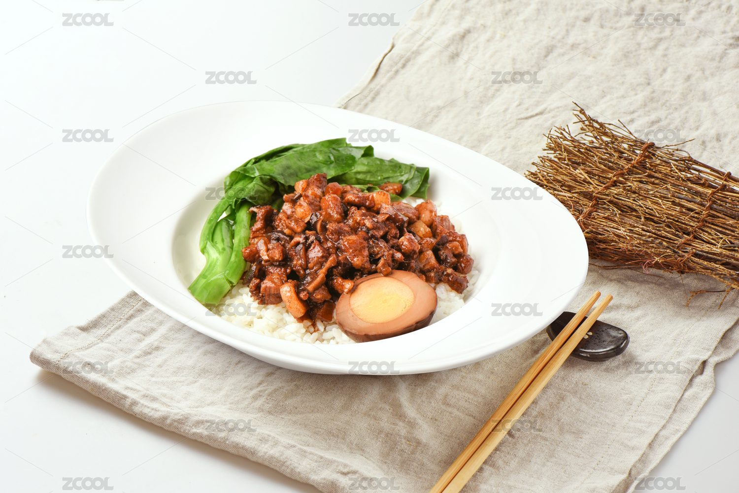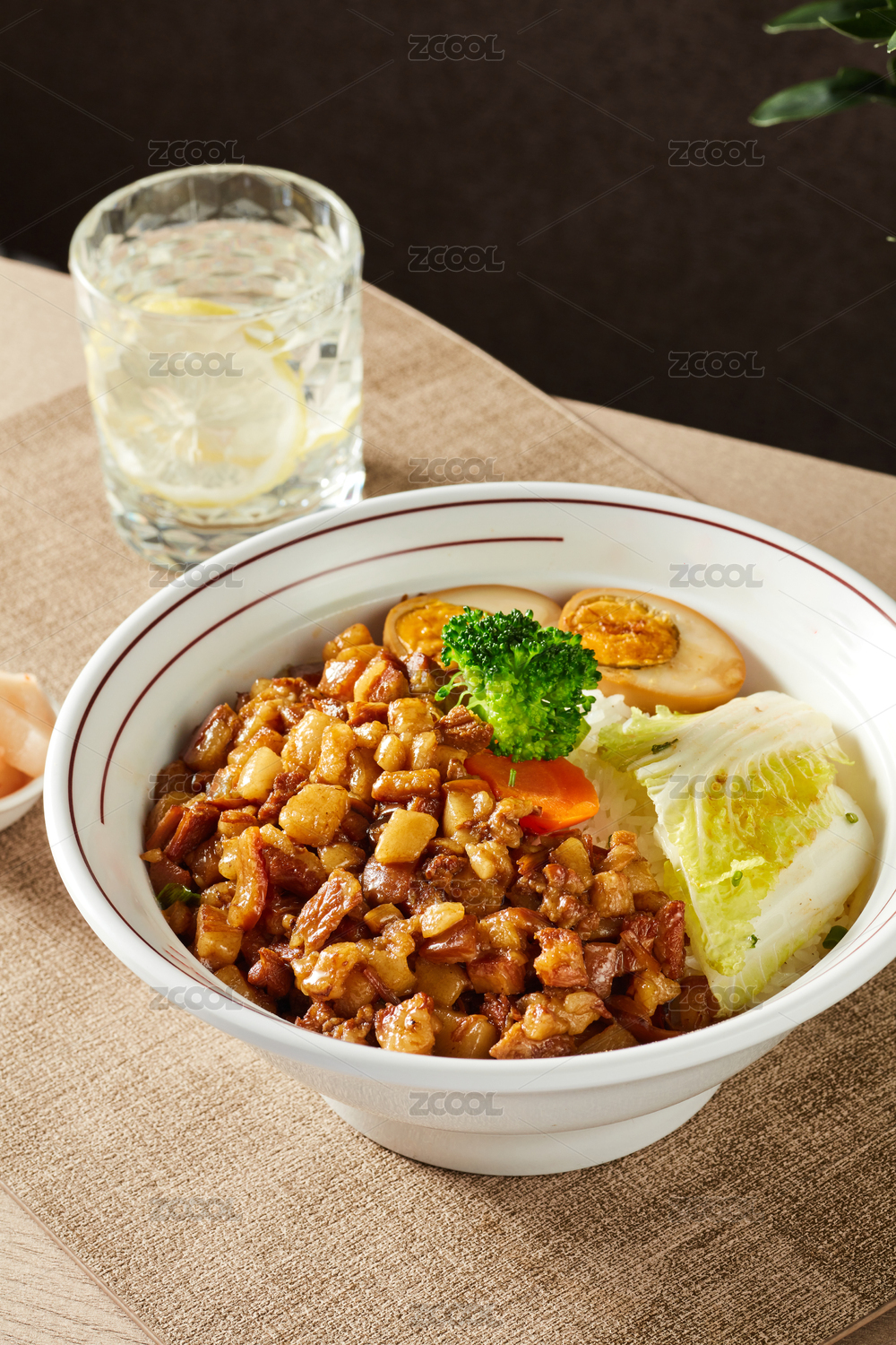 裝在白瓷盤上的一份鹵肉飯