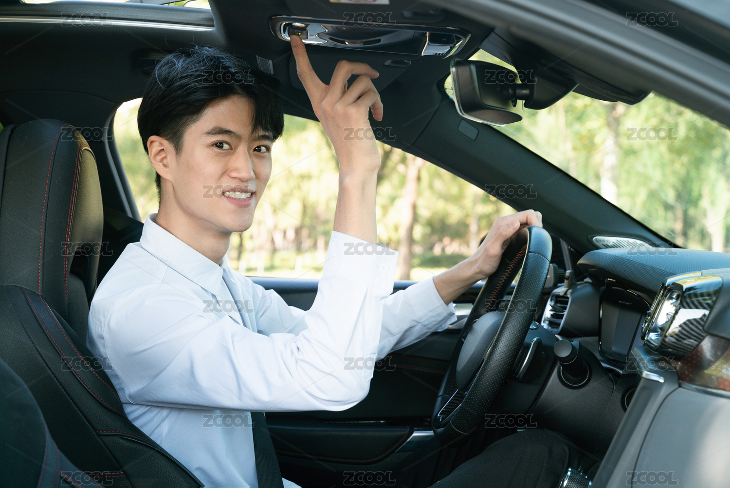 調(diào)節(jié)汽車(chē)內(nèi)飾的白襯衣男性駕駛員