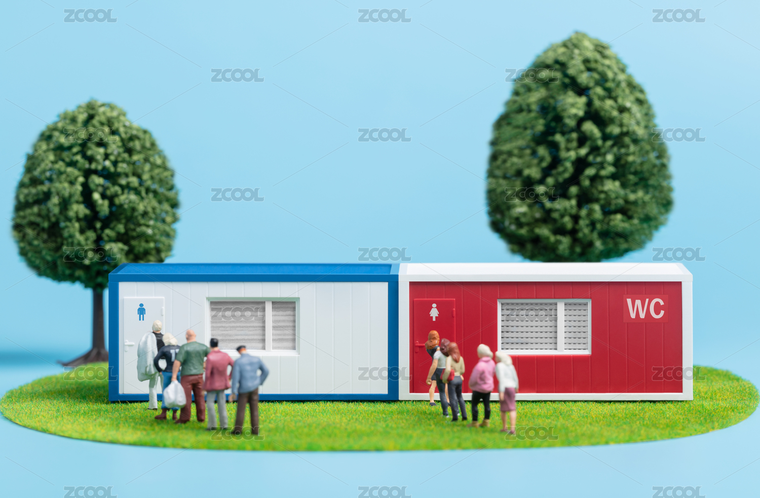 草地排隊(duì)上公廁集裝箱廁所的人群
