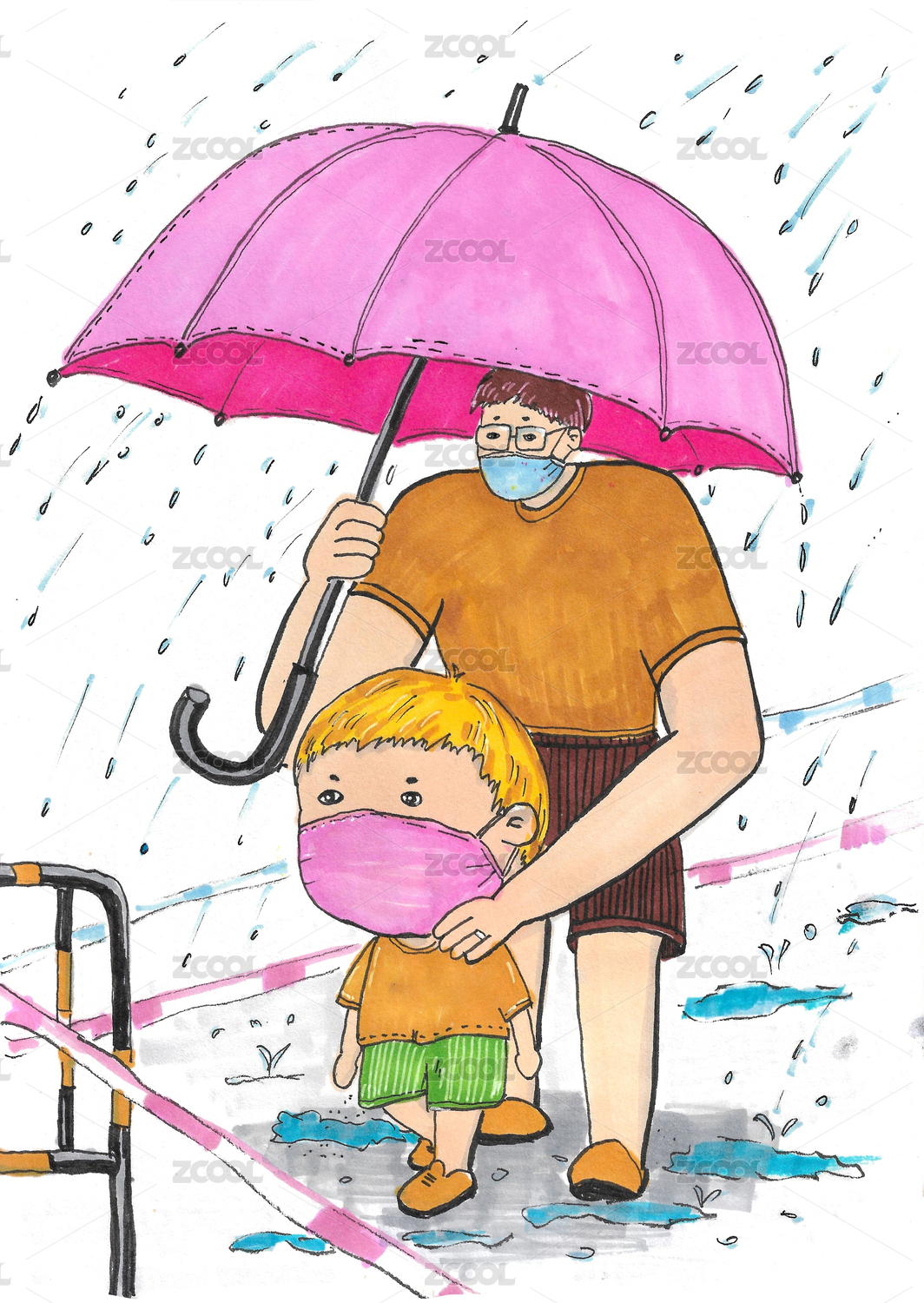 疫情Q版父子下雨天撐著粉色傘排隊(duì)驗(yàn)核酸