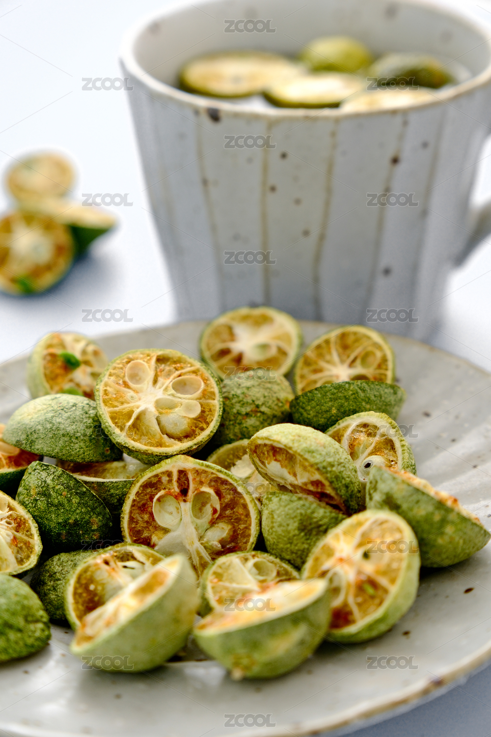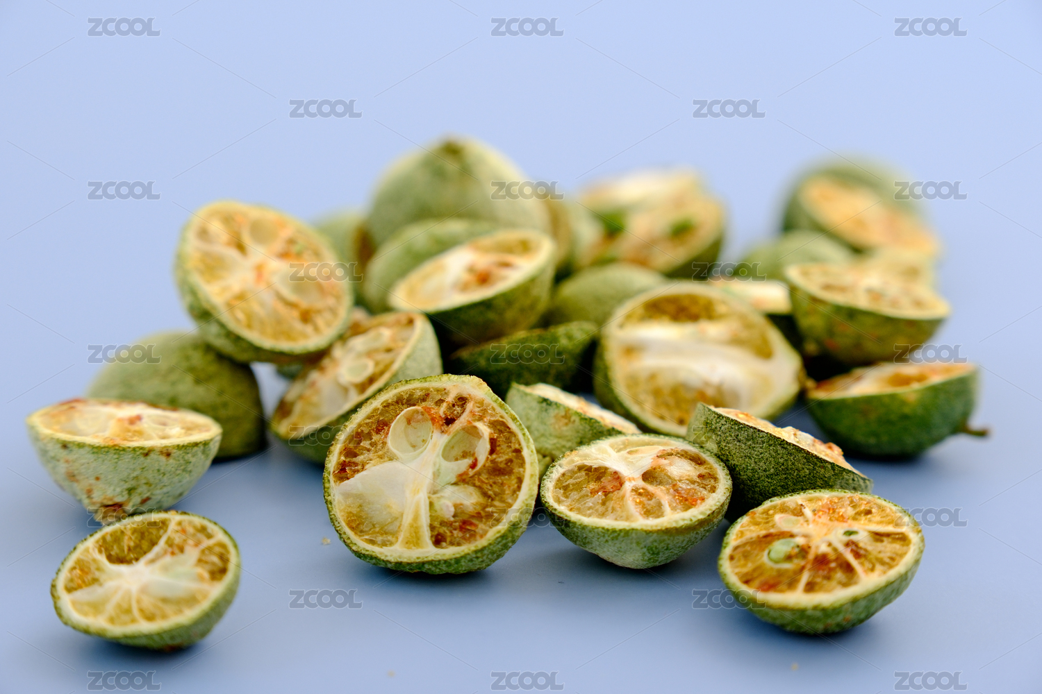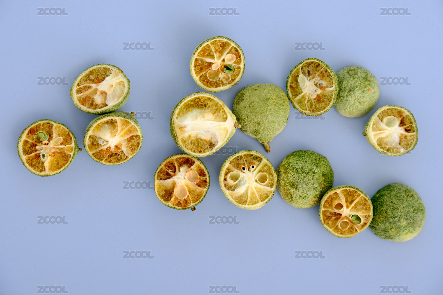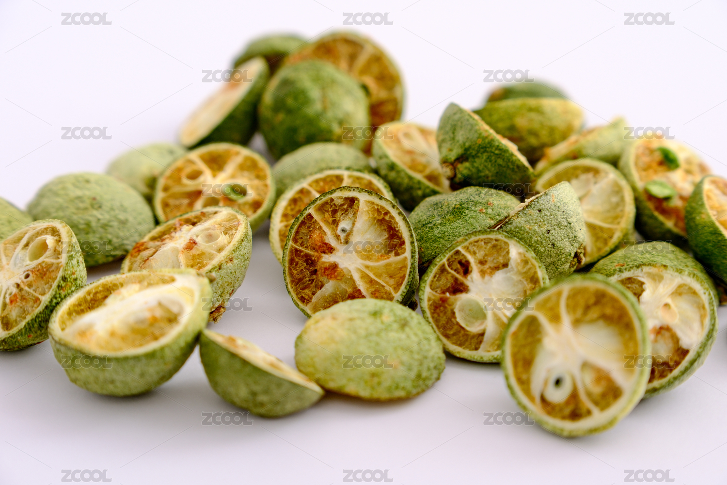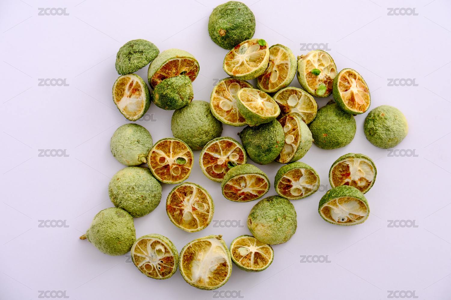 一堆凍干青金桔放在白色背景上