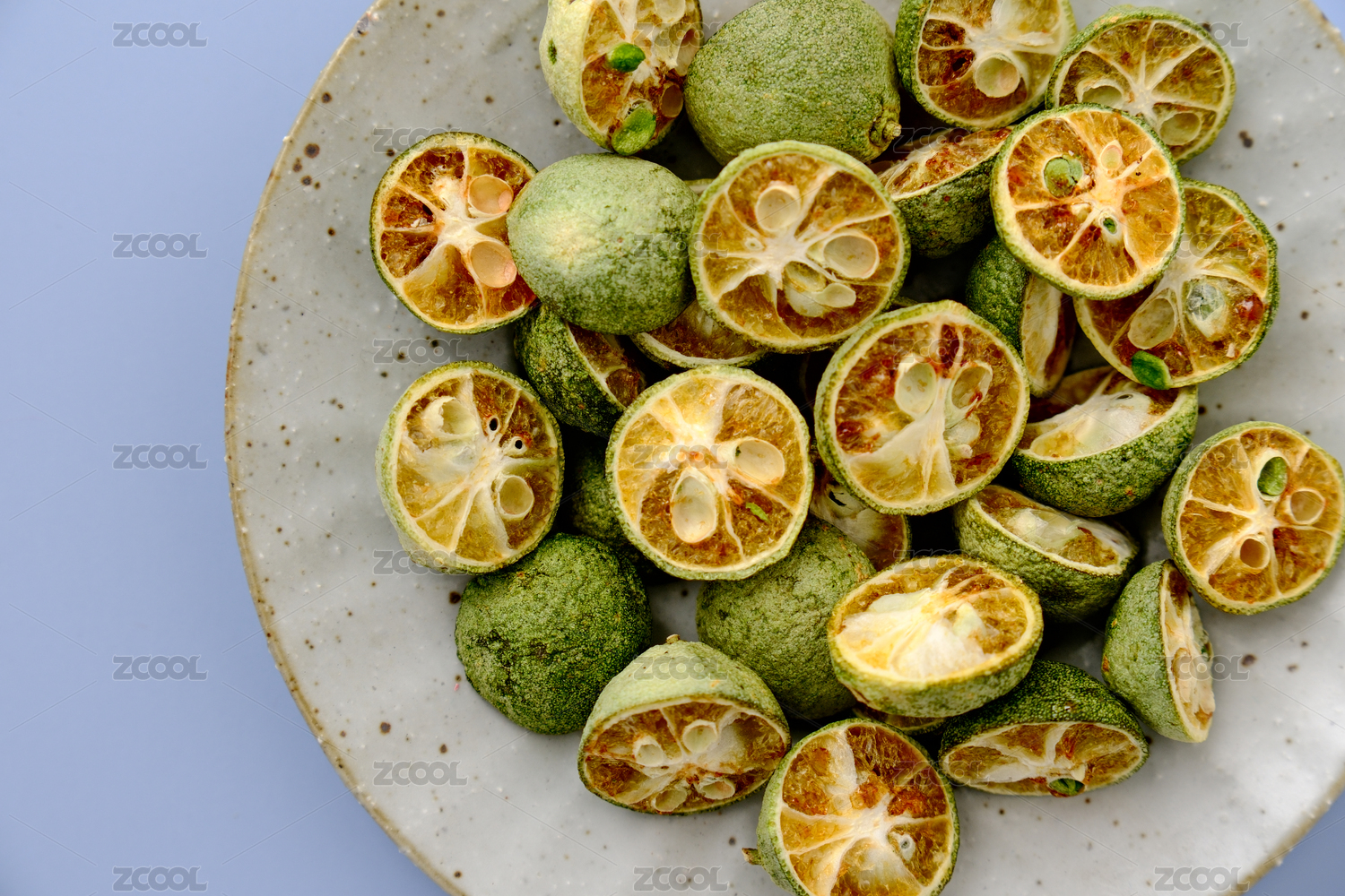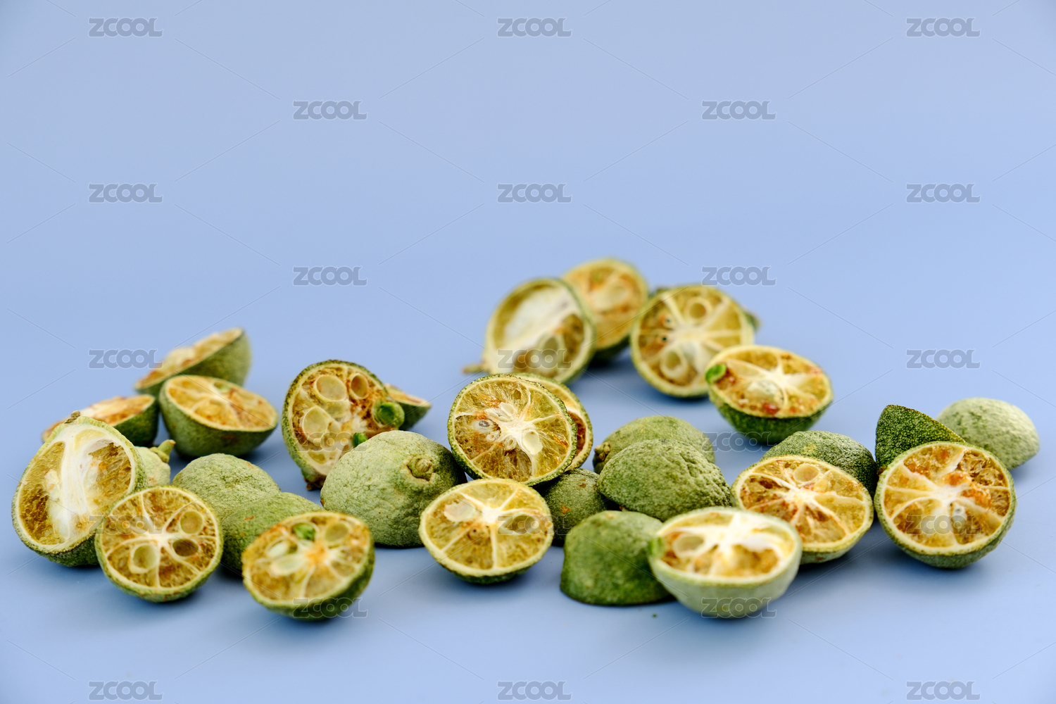 一堆凍干青金桔放在藍色背景上