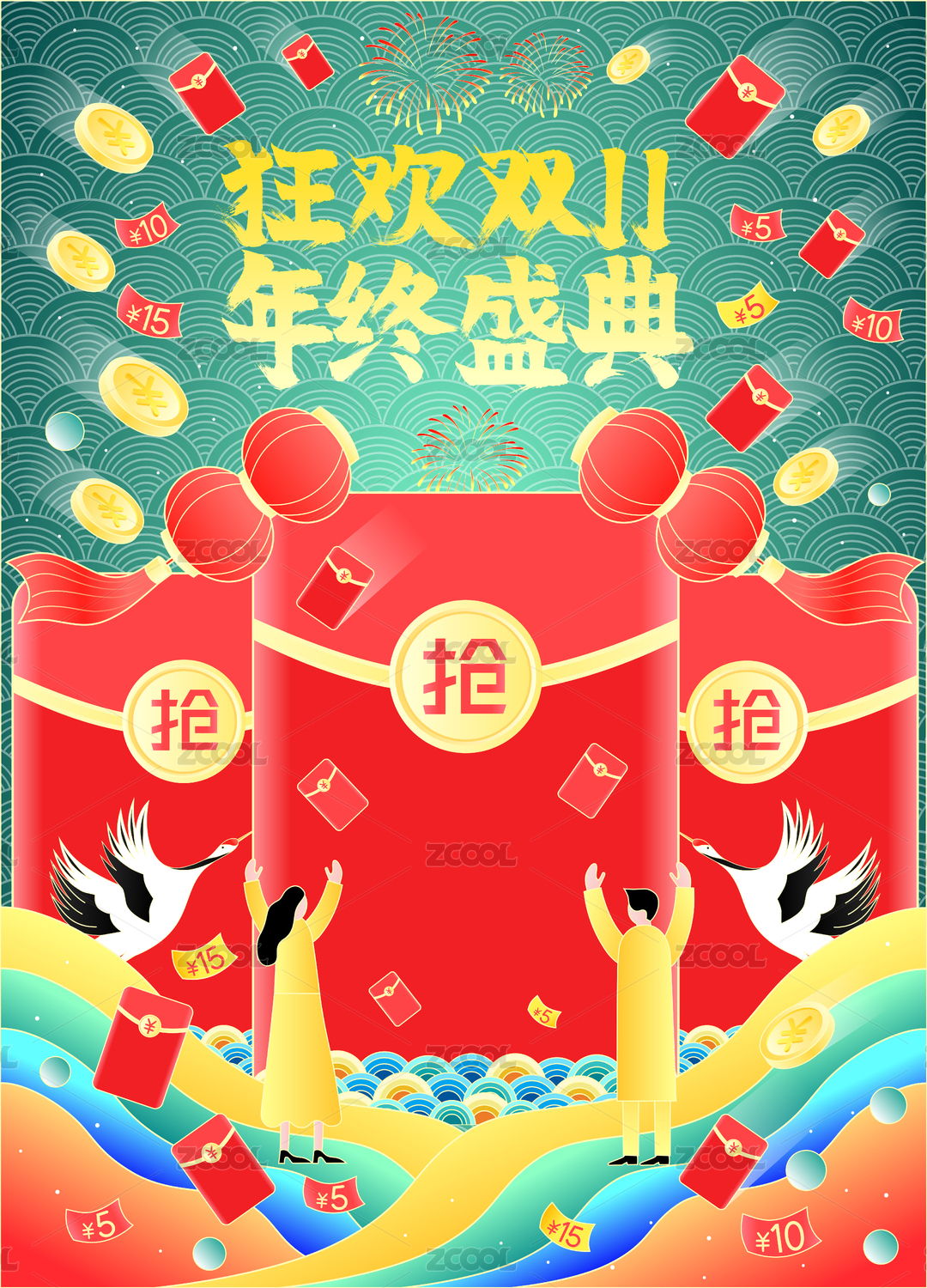 狂歡雙十一年終盛典搶紅包矢量插畫海報(bào)