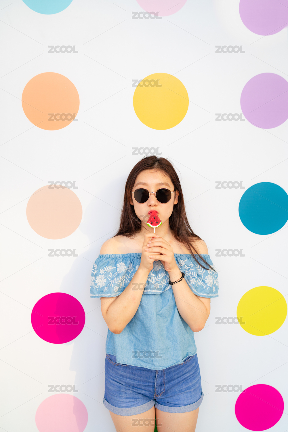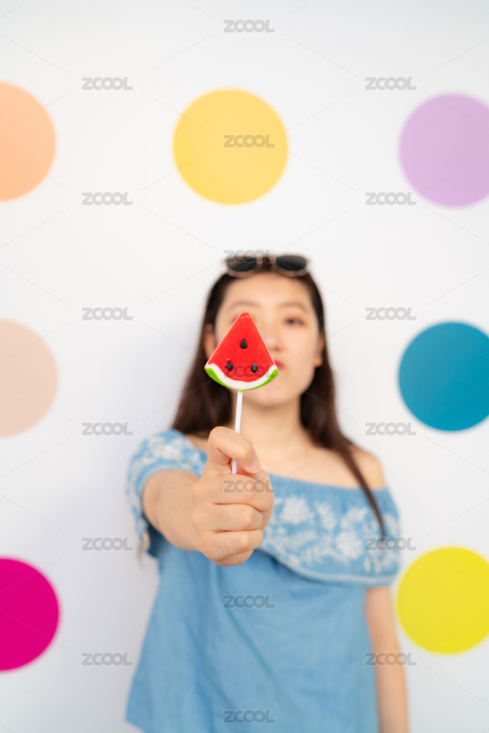 夏日站在創(chuàng)意墻邊的拿著西瓜糖果的美女