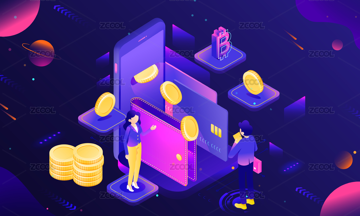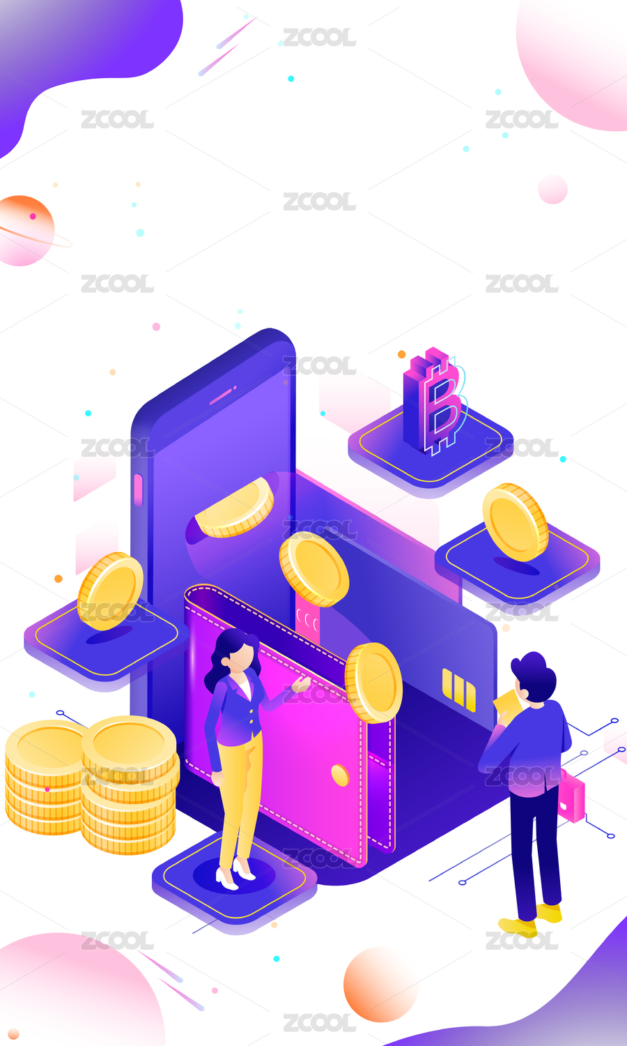 2.5D等距比特幣互聯(lián)網(wǎng)金融概念漸變矢量背景插畫