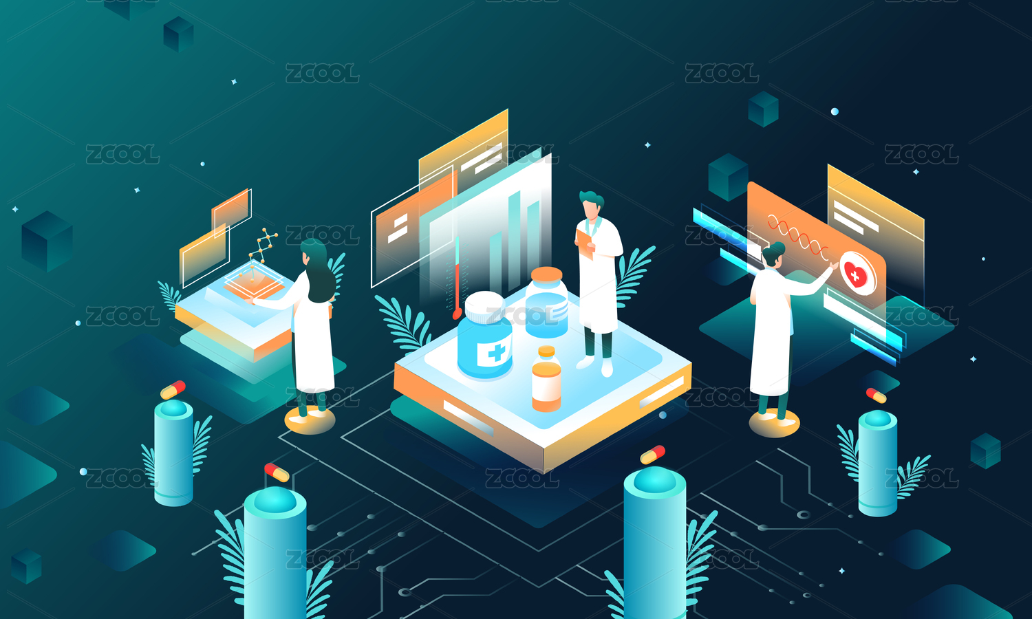 2.5D等距用藥體檢醫(yī)療健康保險漸變背景矢量插畫