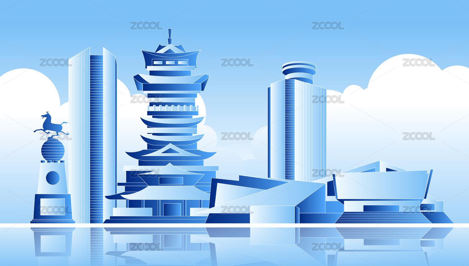 綿陽城市地標建筑群矢量插畫