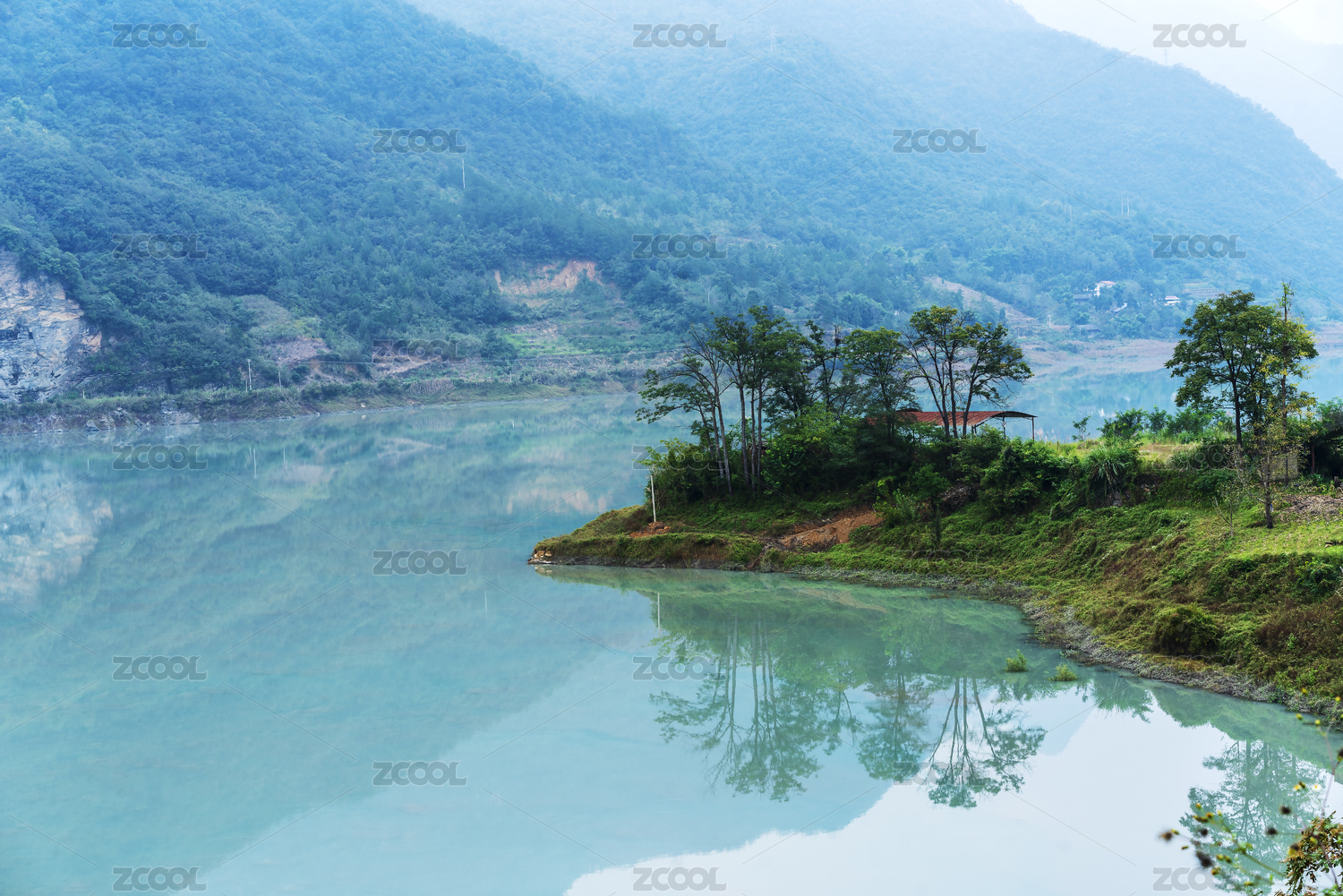 霧汽彌漫的四川省綿陽市涪江六峽峽灣風光