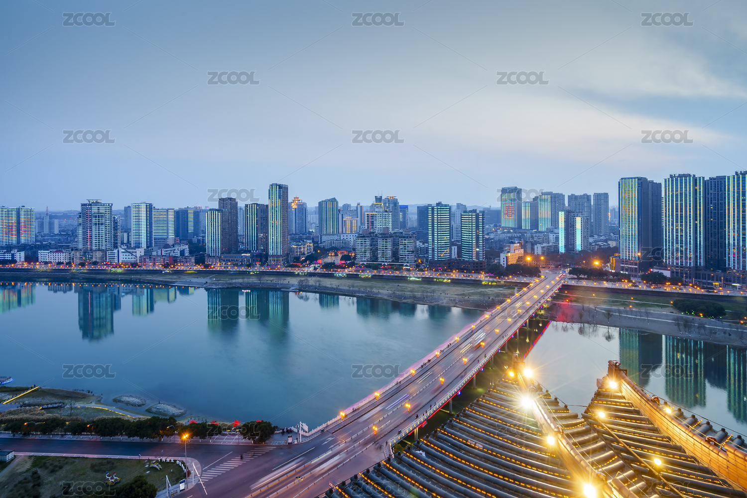 中國四川省綿陽市涪江畔的越王樓和城市現(xiàn)代建筑夜景和江里的倒影