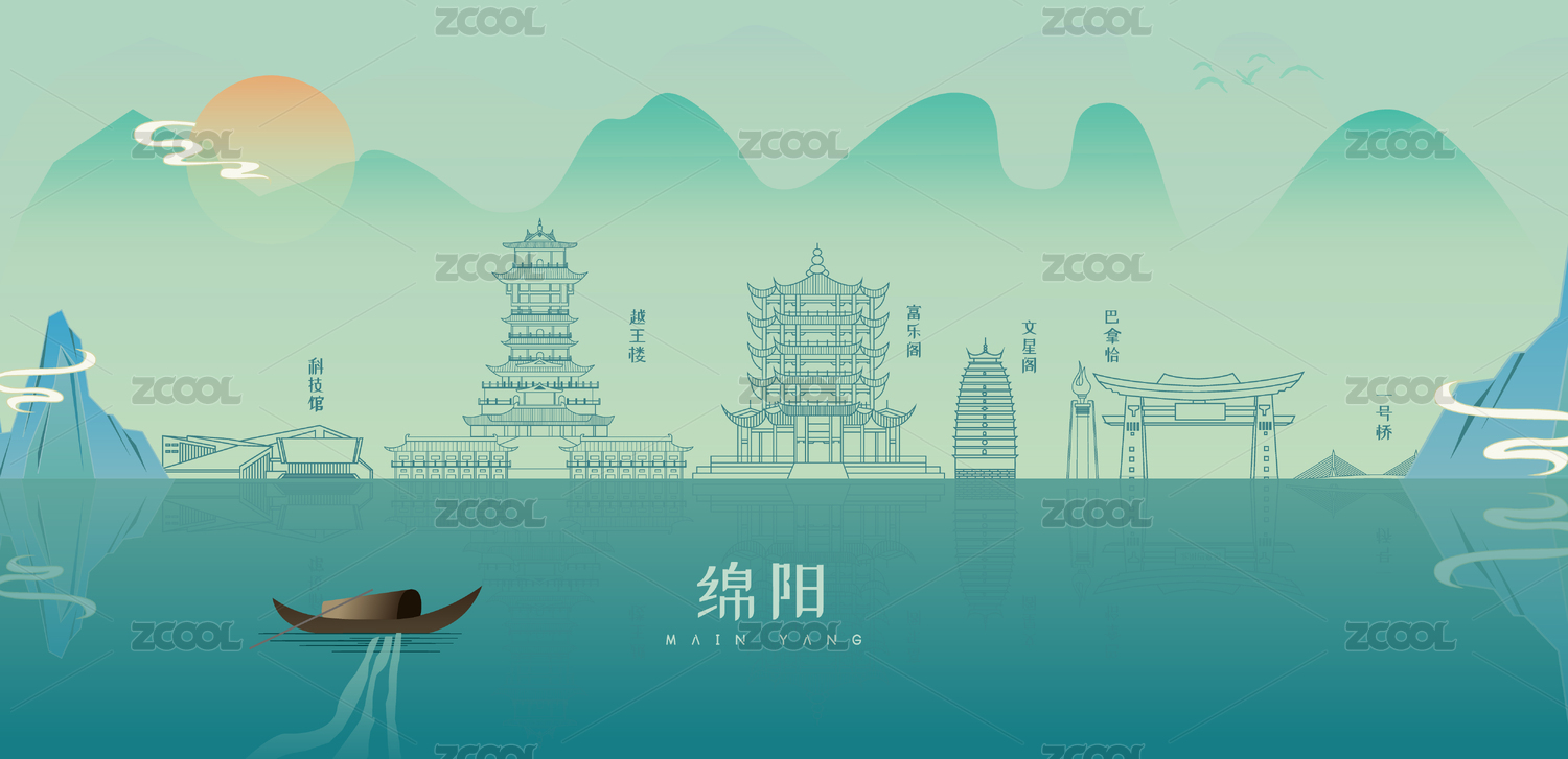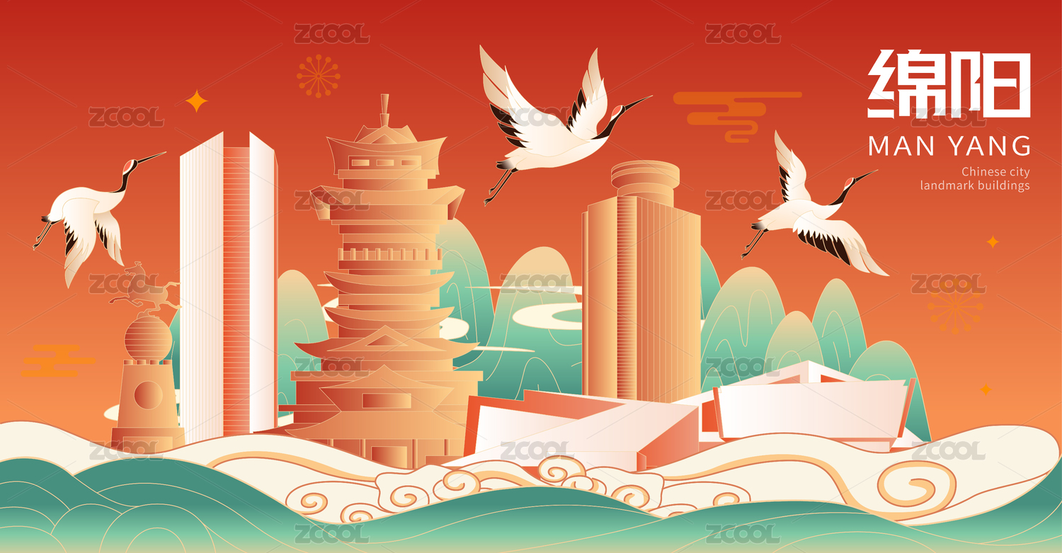 綿陽地標建筑國潮插畫