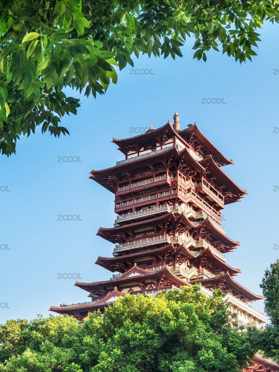 晴朗天氣藍天綠樹中的中國四川綿陽越王樓古建筑俯視圖