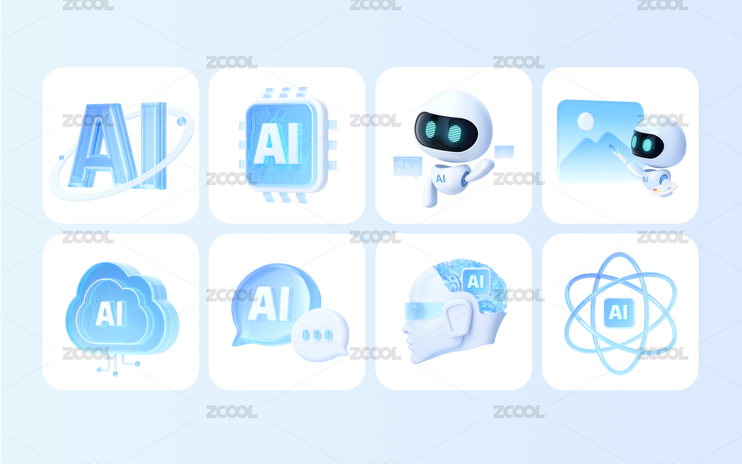 人工智能科技技術(shù)藍(lán)白概念3D圖標(biāo)合集