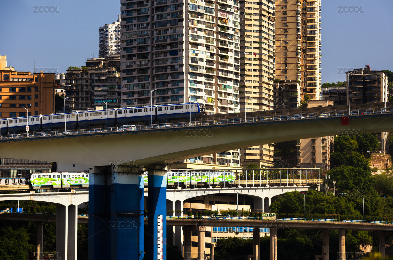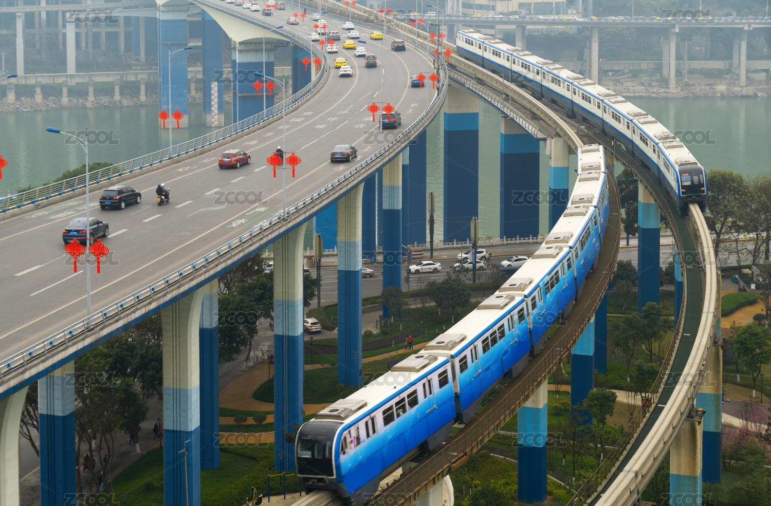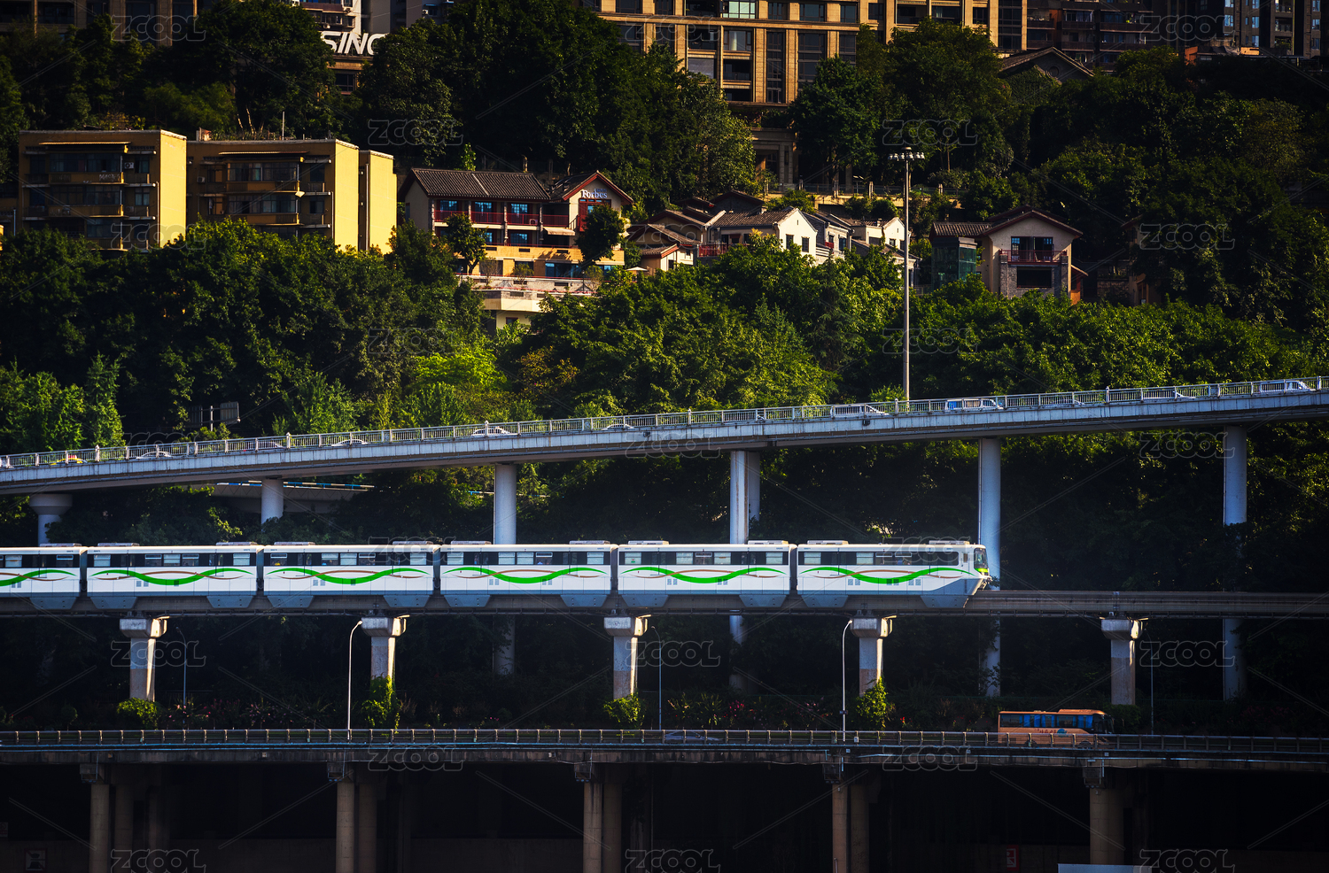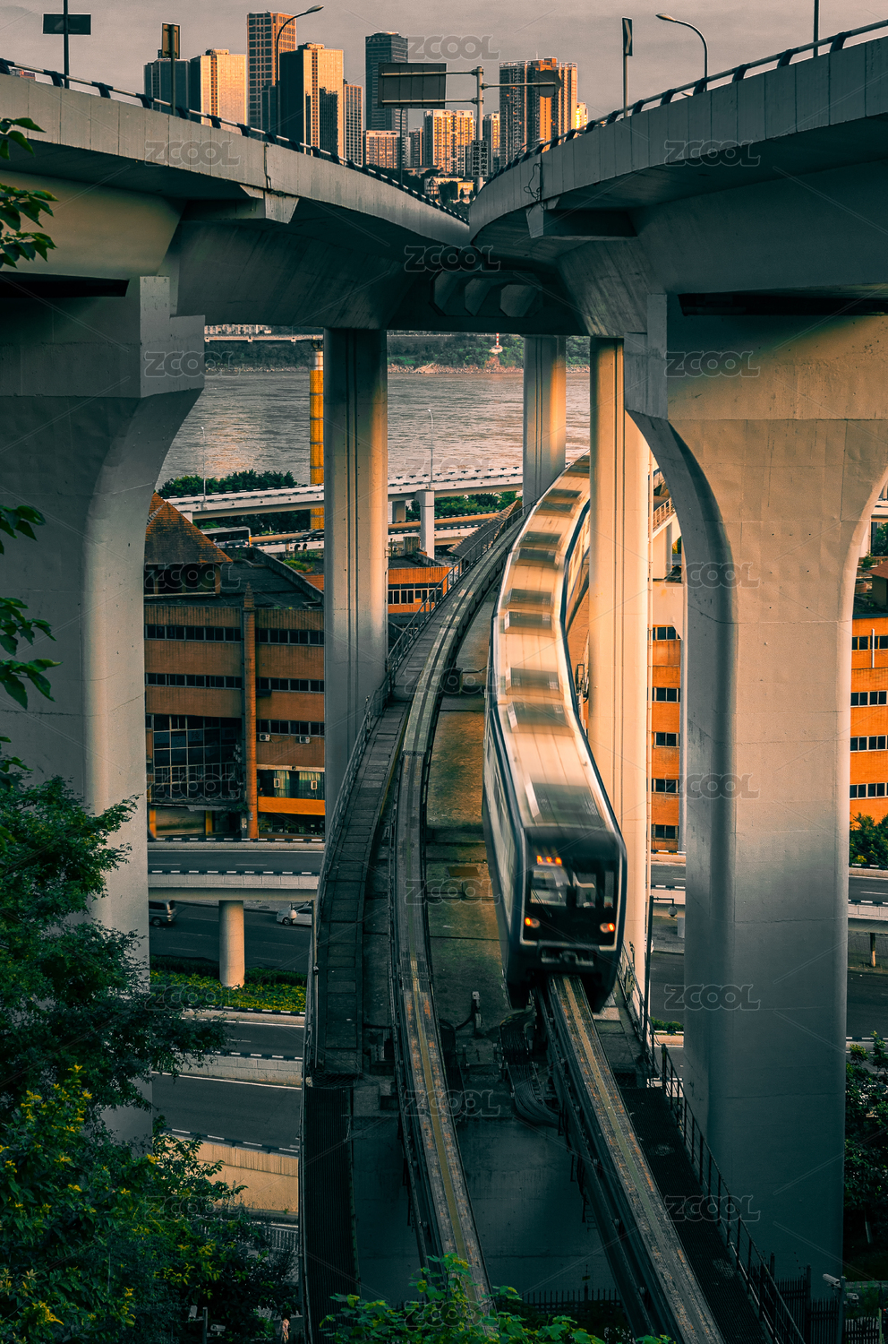 中國重慶-黃昏時分一輛通過立交的輕軌列車
