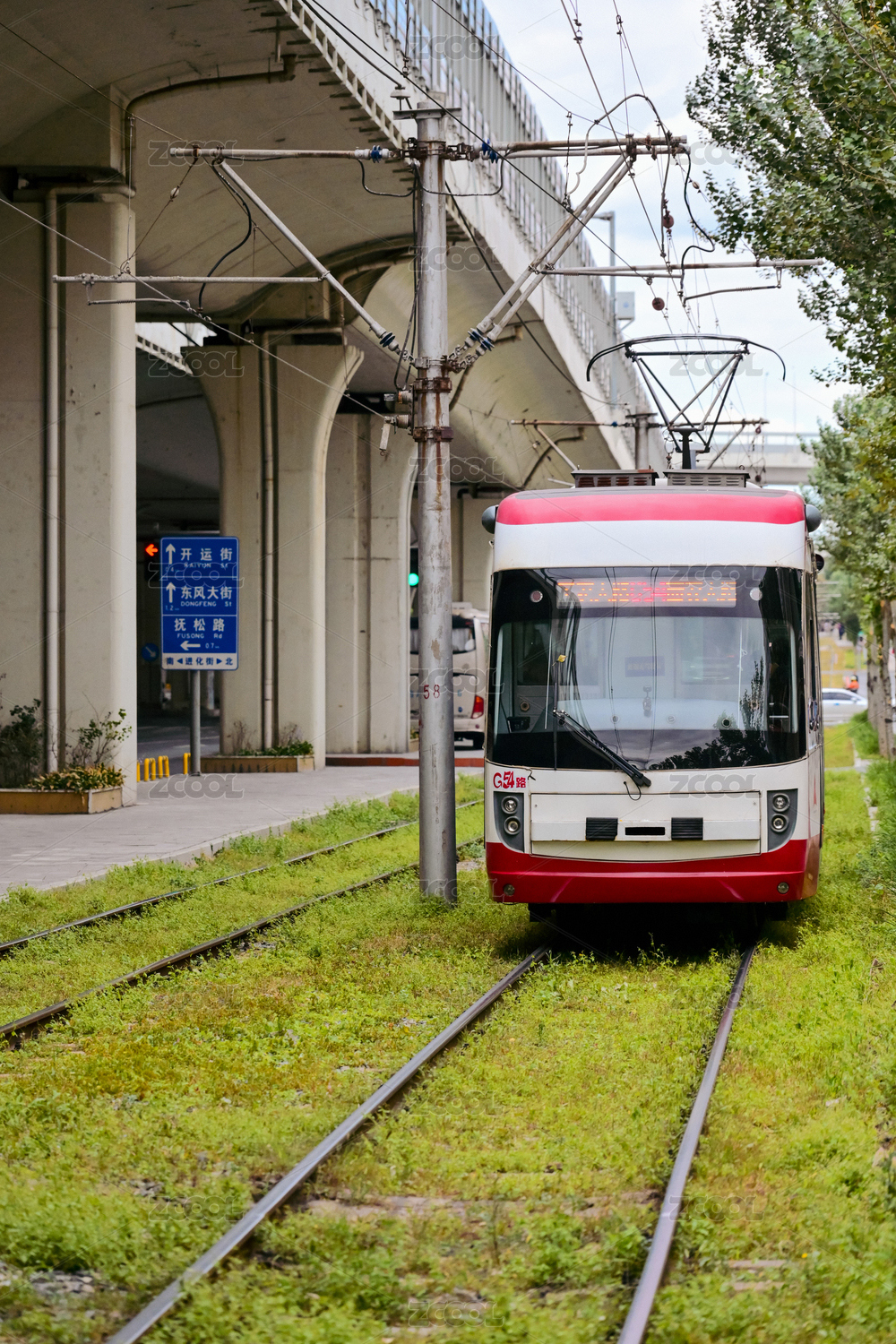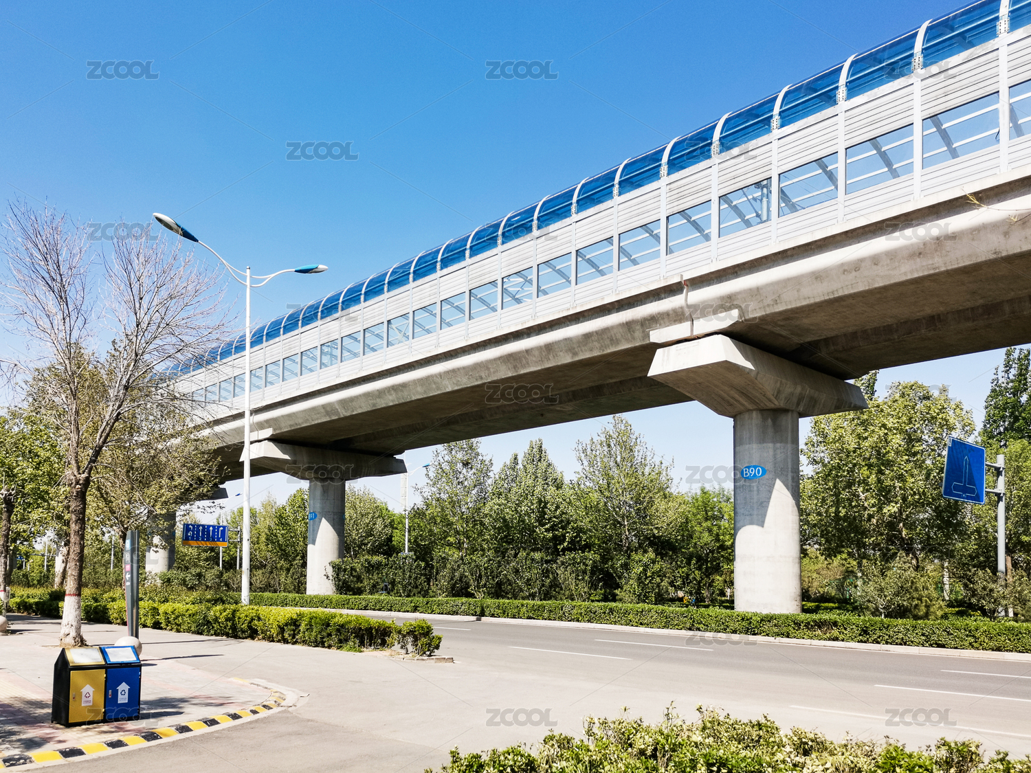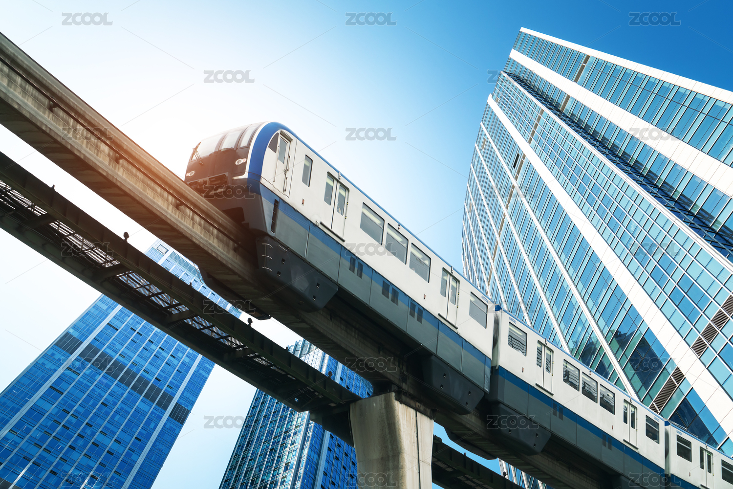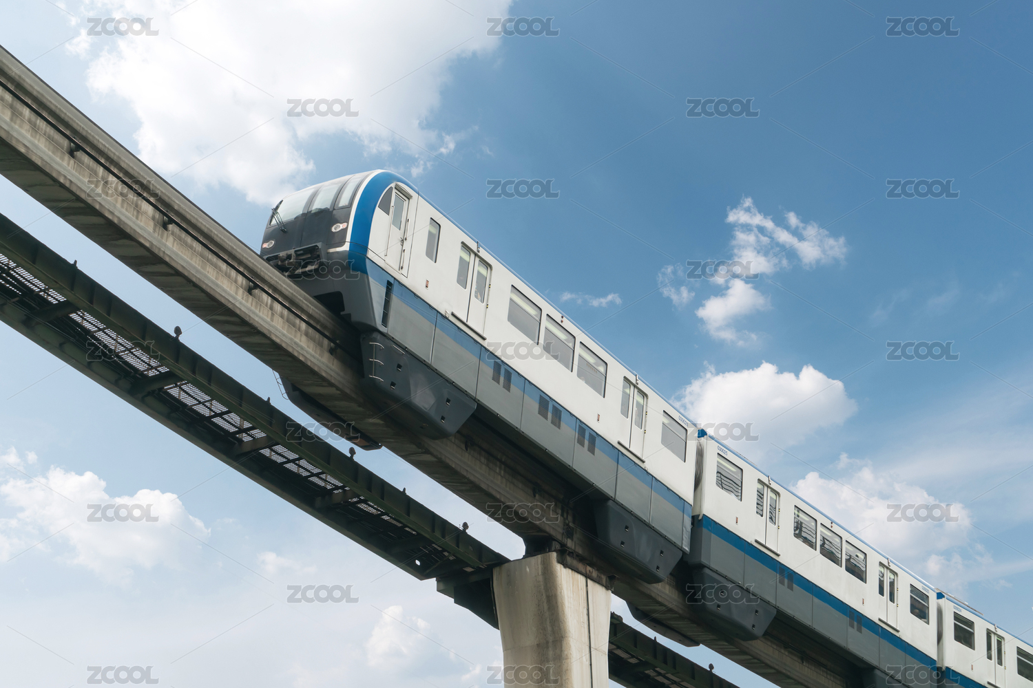 中國重慶-黃昏時分一輛通過立交的輕軌列車
