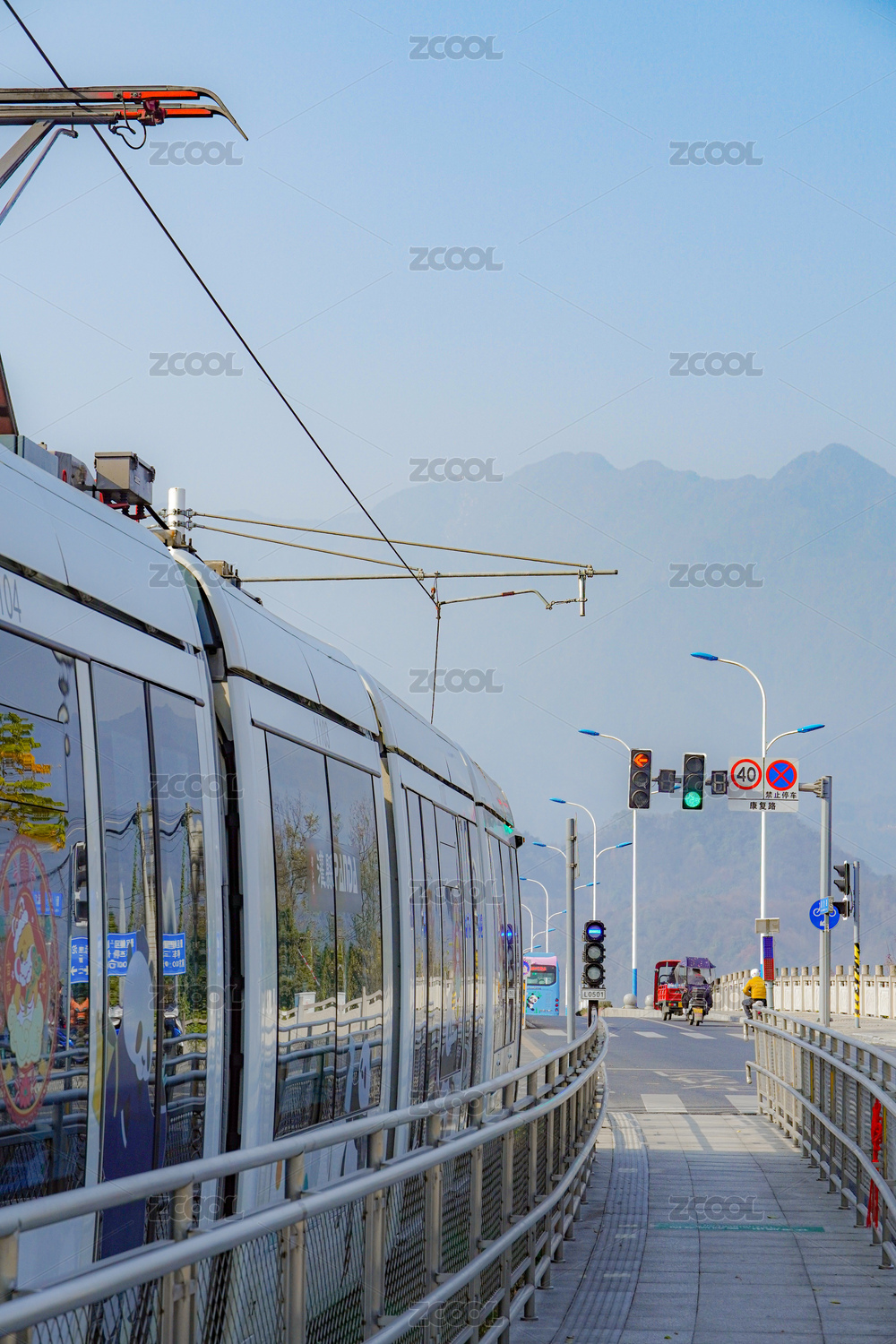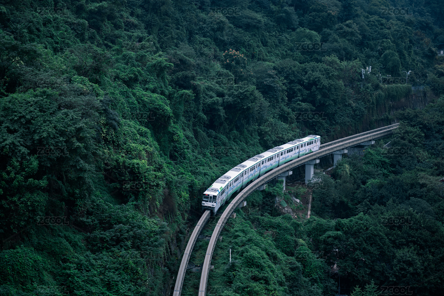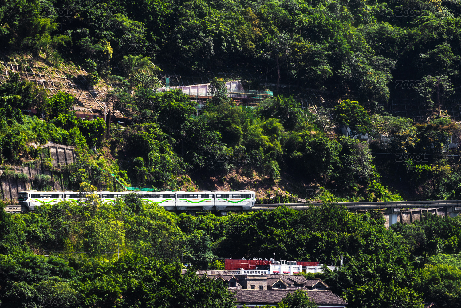 中國重慶:一輛正在山嶺中穿行的輕軌列車