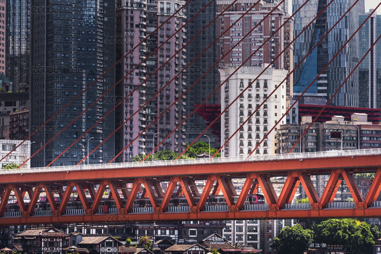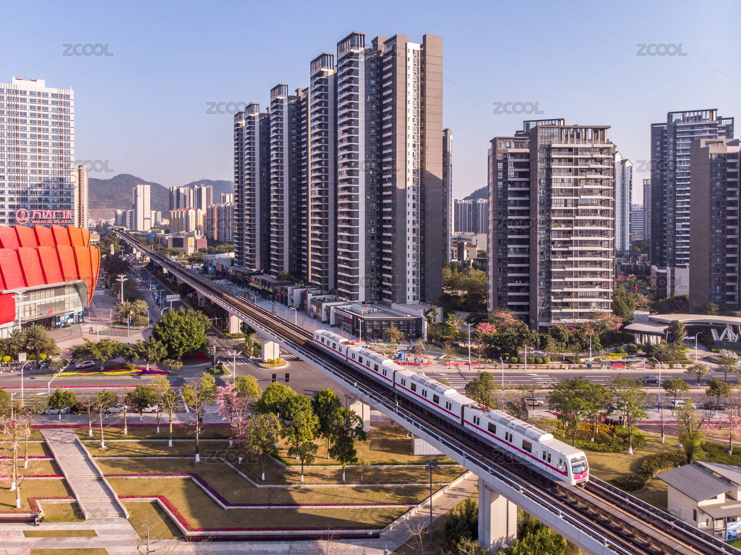 俯拍中國重慶輕軌3號線從樓宇之間穿過