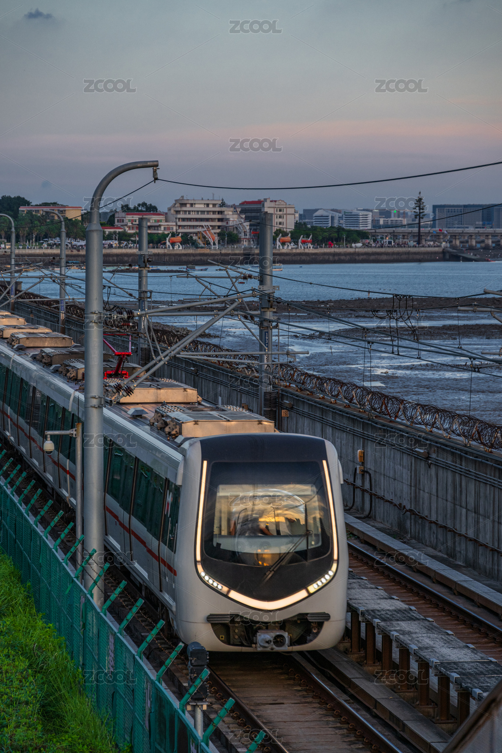 城市輕軌列車在黃昏時分沿高架軌道行駛