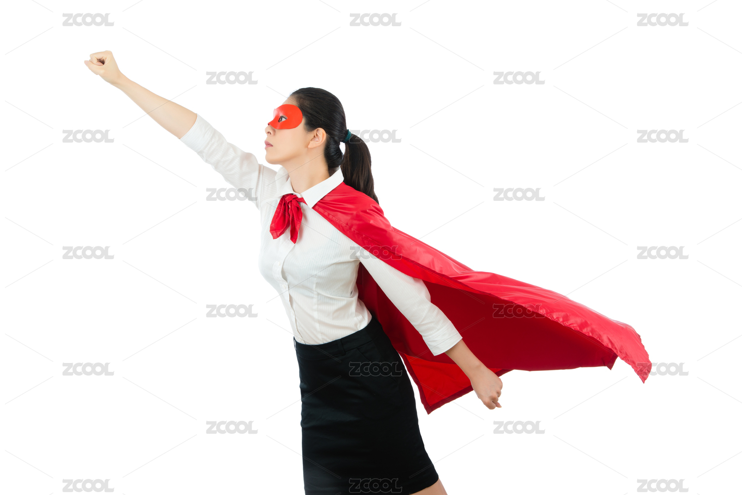超級英雄的女商人用紅色英雄護(hù)目鏡飛披肩服裝姿勢拳頭準(zhǔn)備起飛了空白區(qū)域概念的白色墻壁COPYSPACE背景之上。