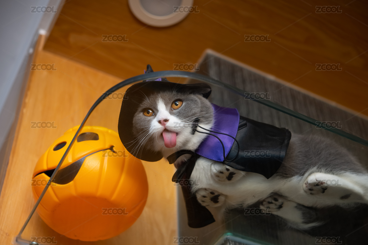 柜子上穿上萬圣節(jié)女巫披肩的英短藍(lán)貓