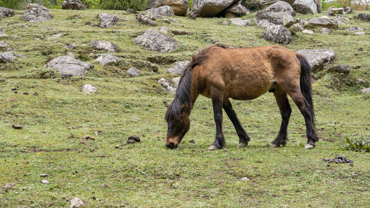 四川阿壩四姑娘山海子溝吃草的馬匹