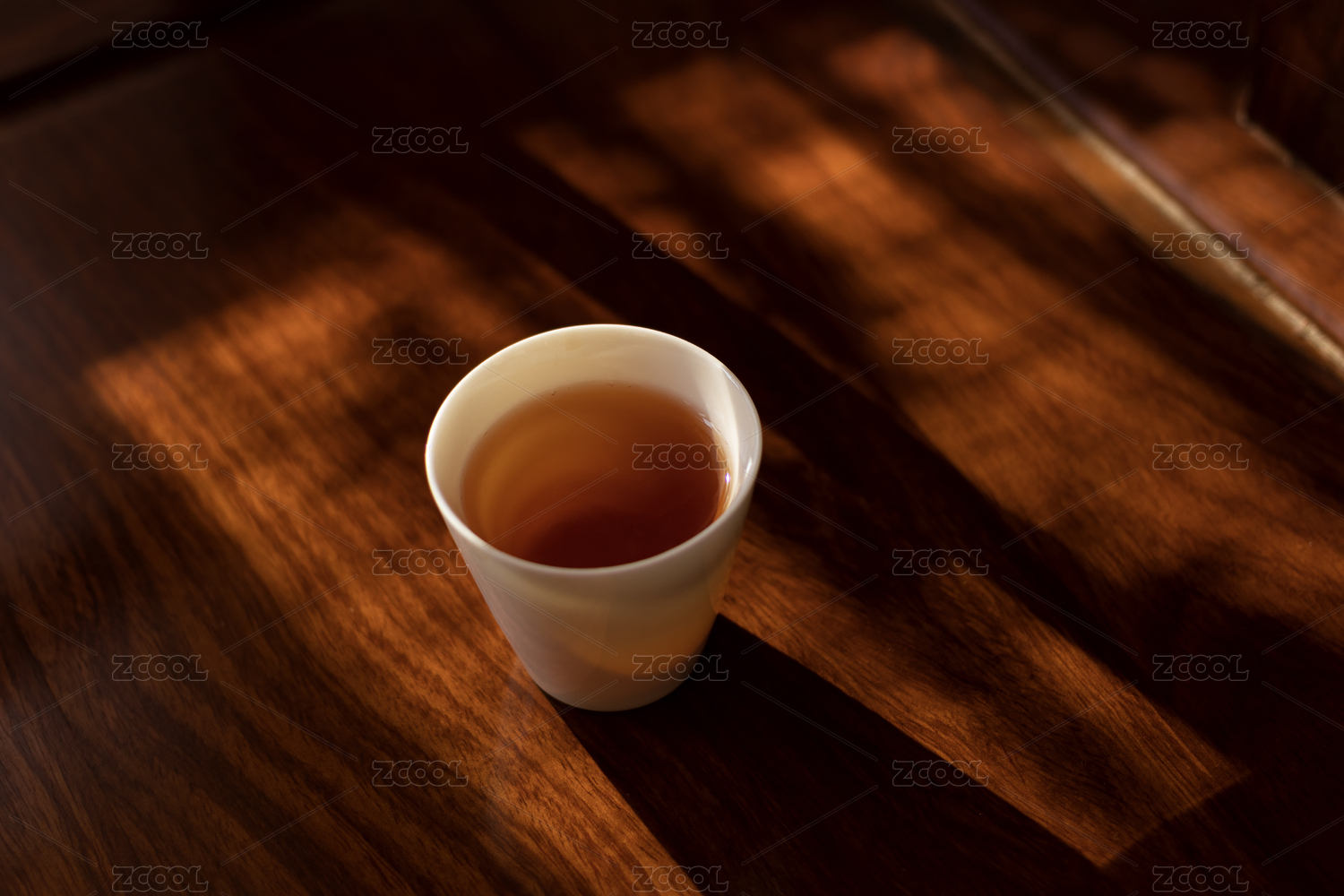 黃昏陽光下在木桌上放著的紅茶
