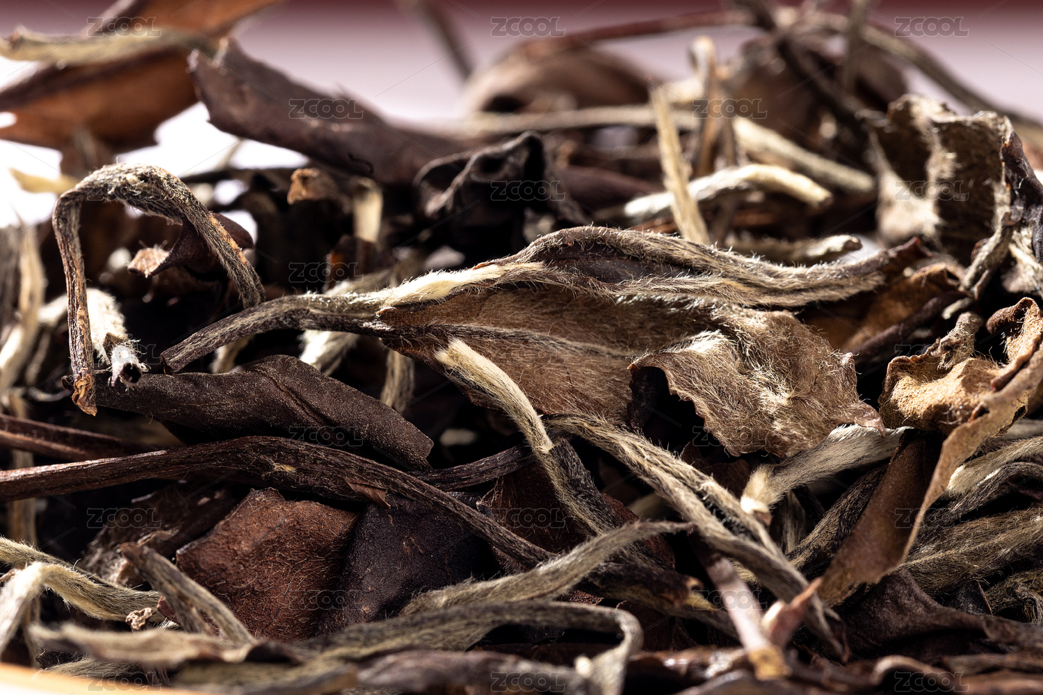 純色背景上的福鼎白茶壽眉茶葉頂視