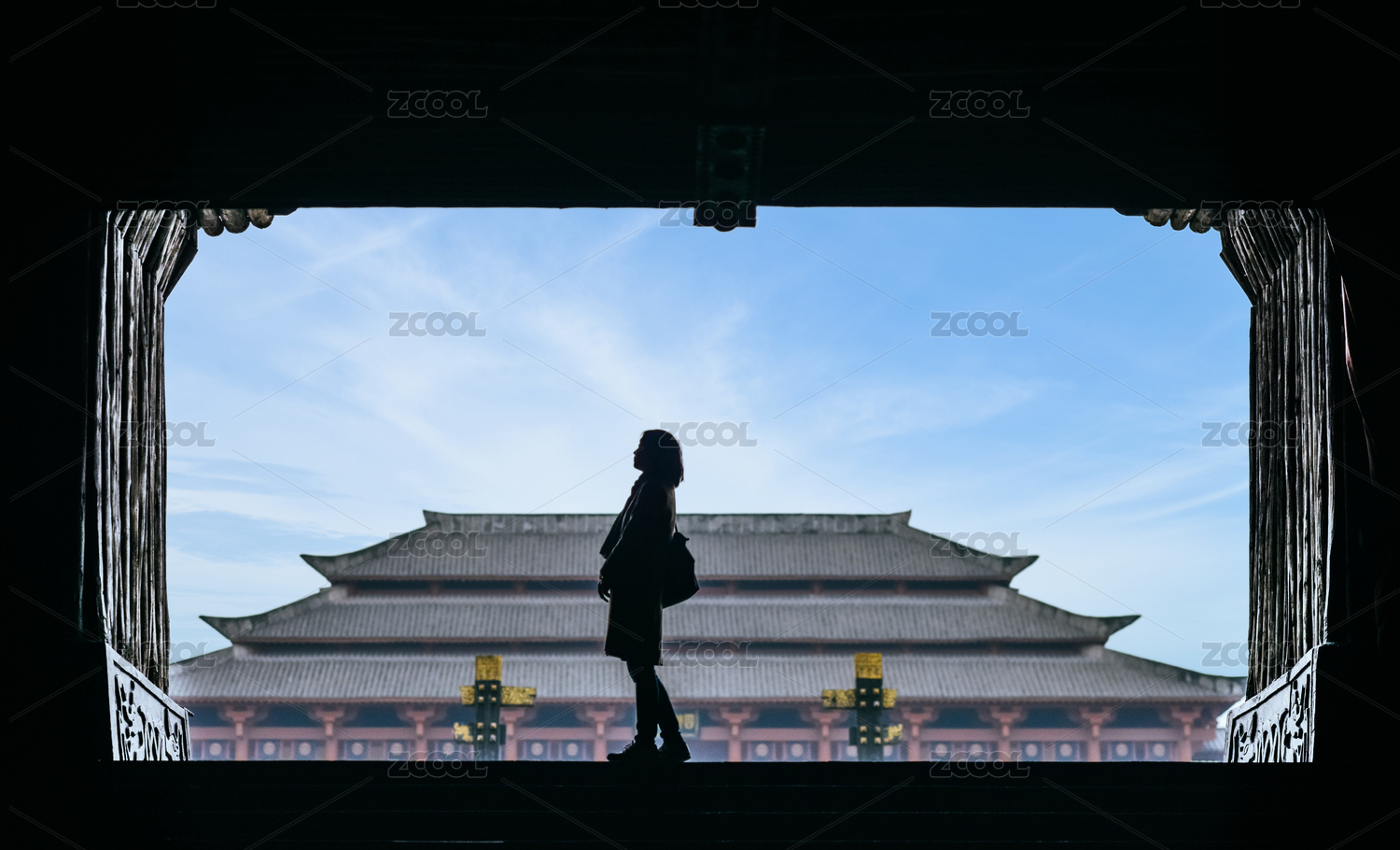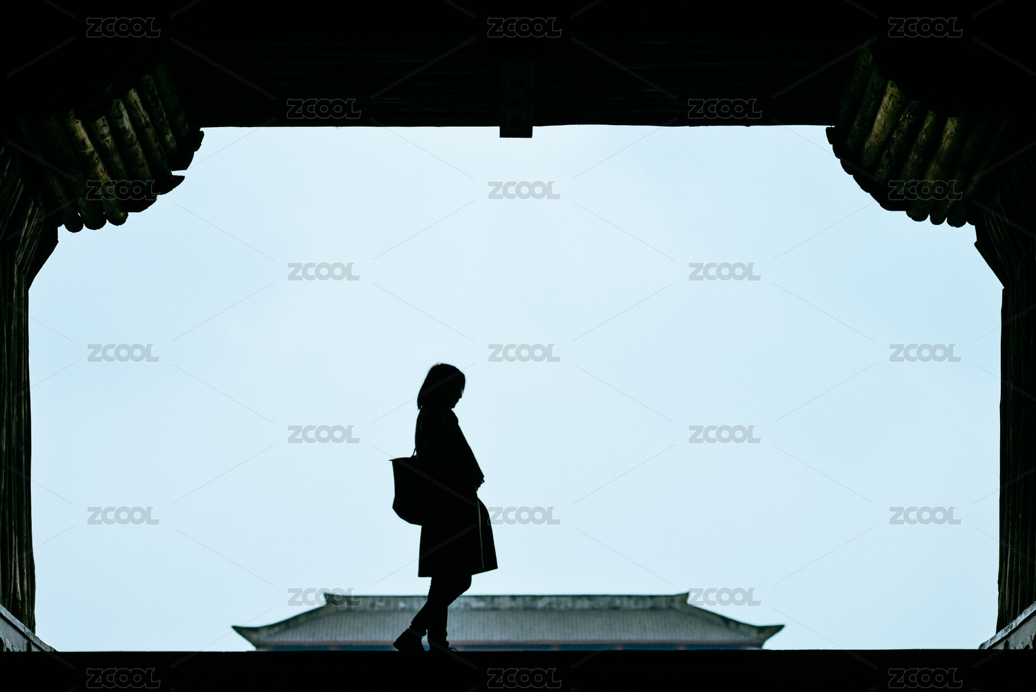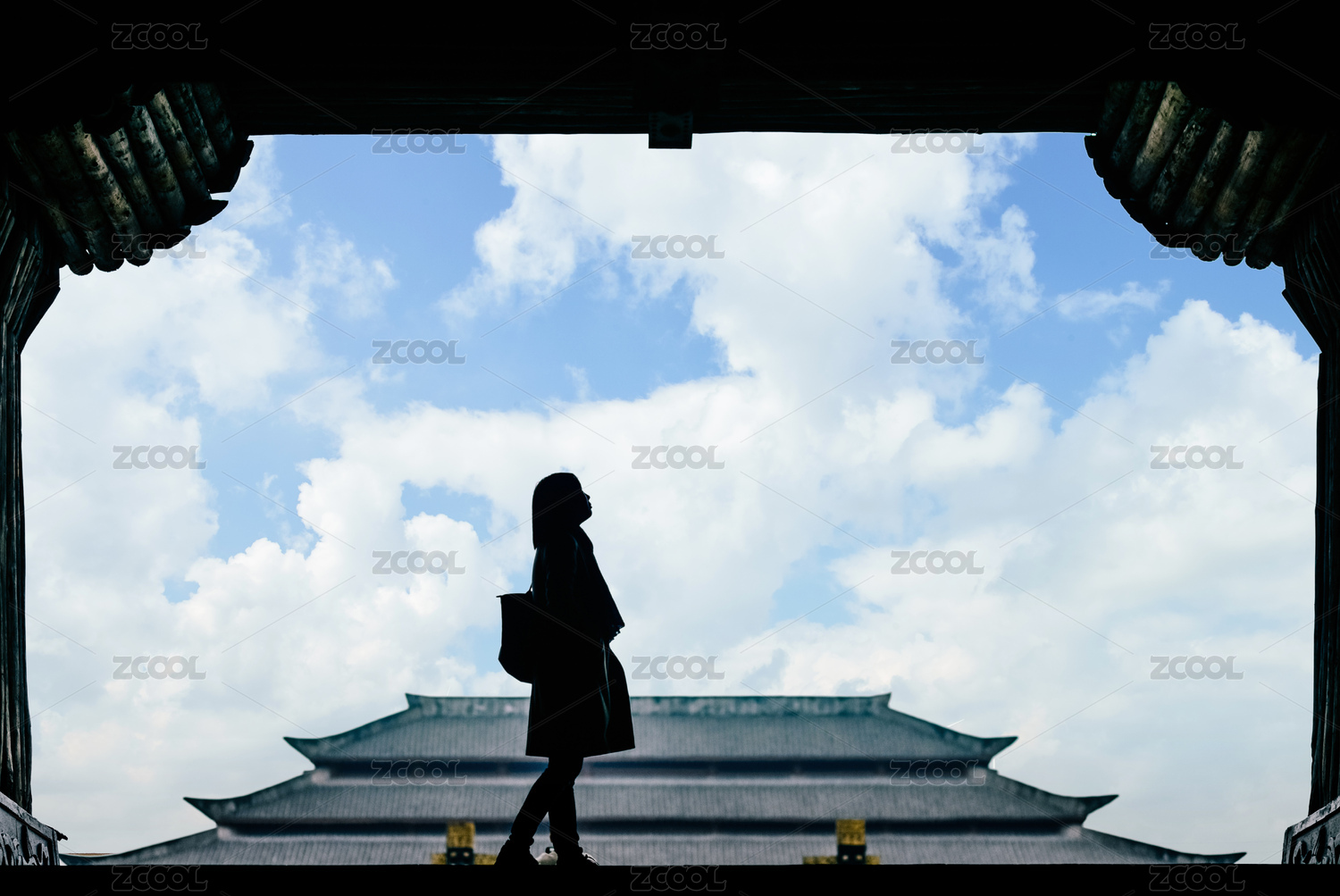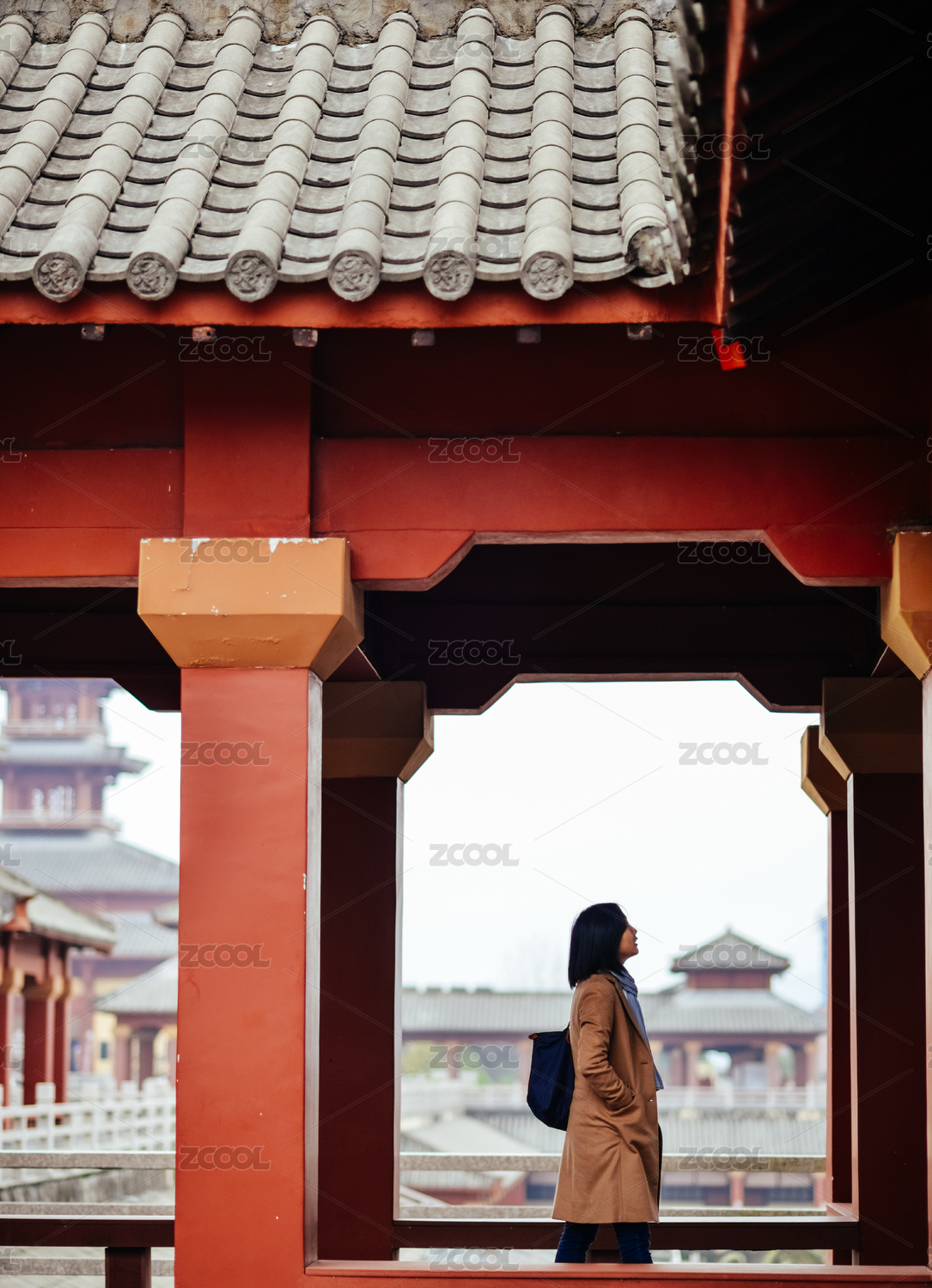 現(xiàn)代女性在橫店秦王宮影視城古建筑的城門