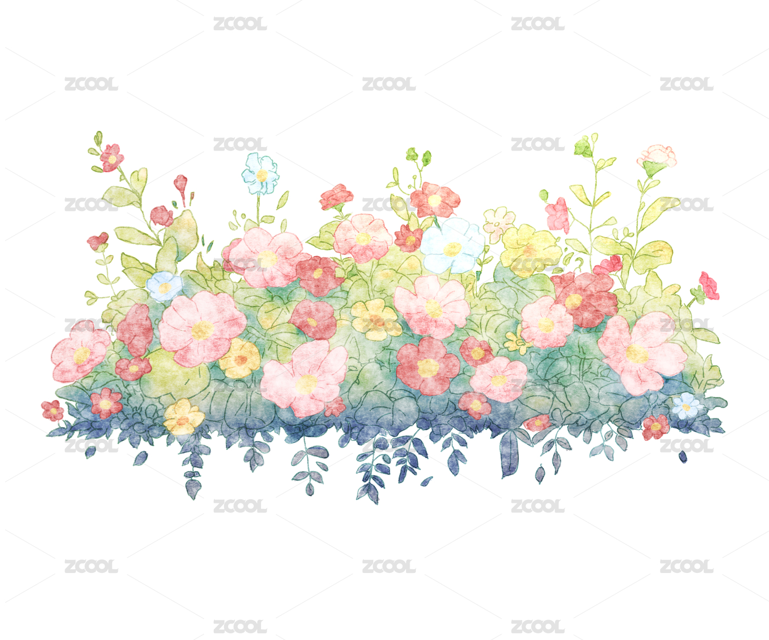 原創(chuàng)綠色花叢春天繁花清新白底貼紙元素插畫