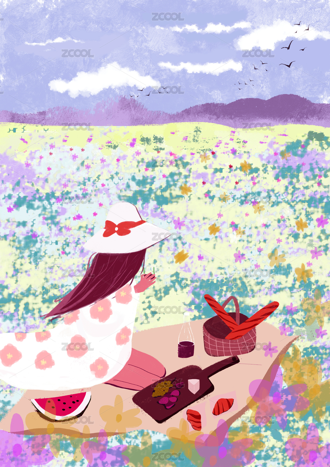 春天女孩子在花叢中野餐插畫