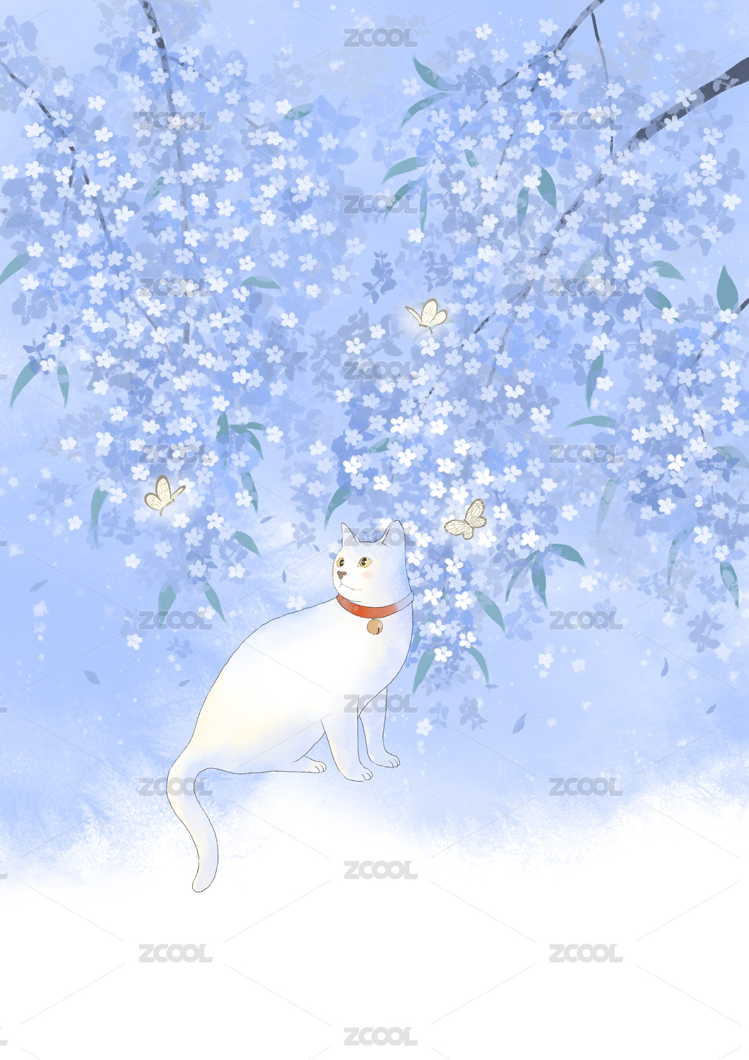 花卉花叢白色可愛穿裙子的兔小姐治愈系插畫