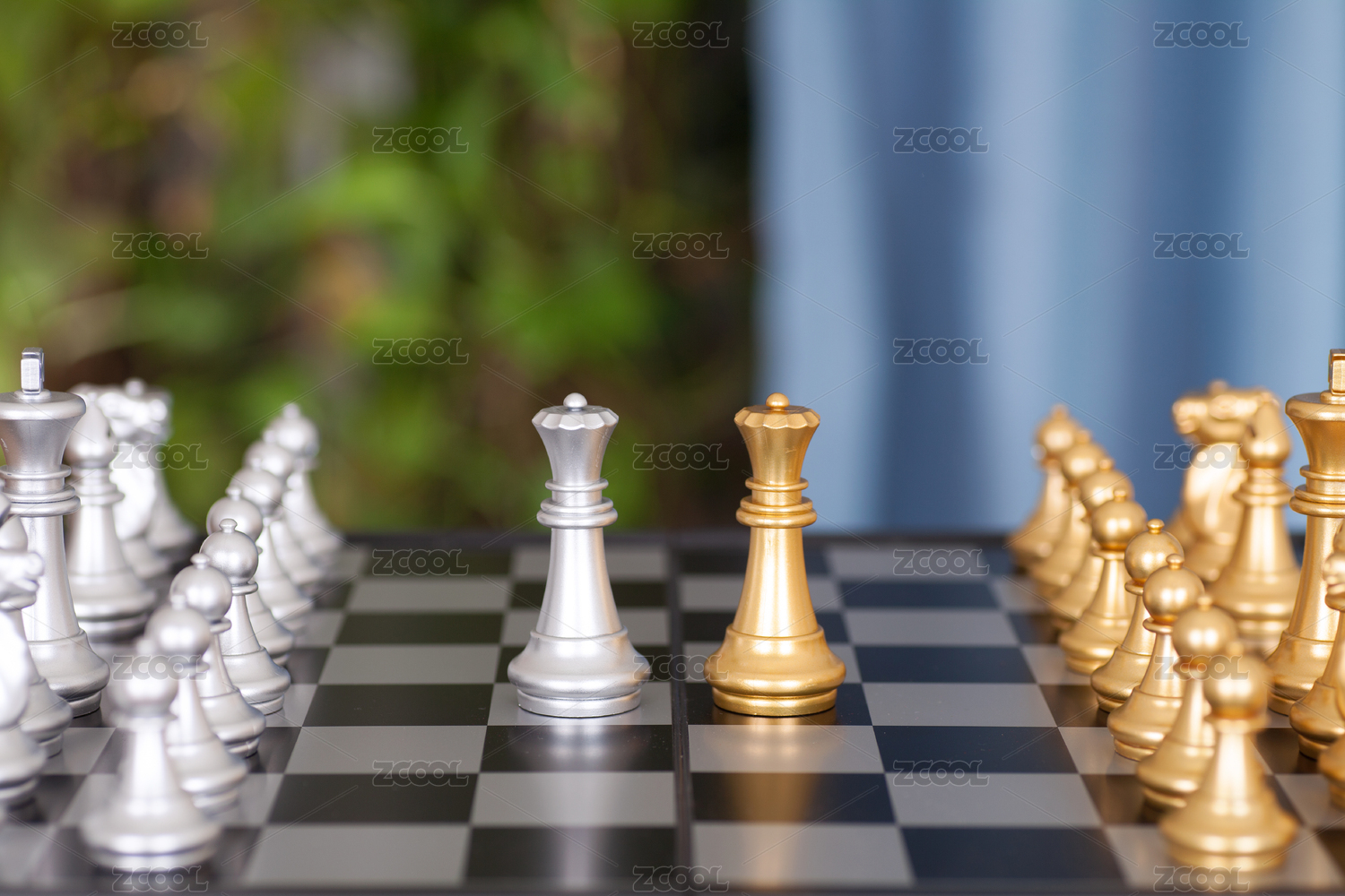 國際象棋棋盤上嚴(yán)正以待的雙方棋子和兩枚近距離對峙的雙方王后棋子