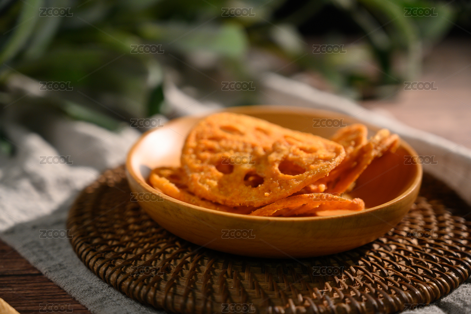 桌面上的盤子里的美味可口的香辣藕片