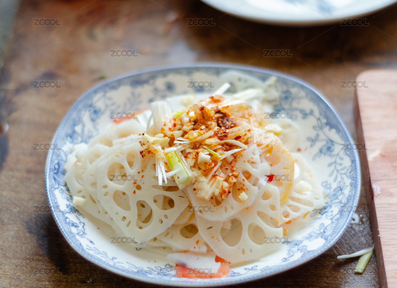 藍白瓷盤裝涼拌藕片