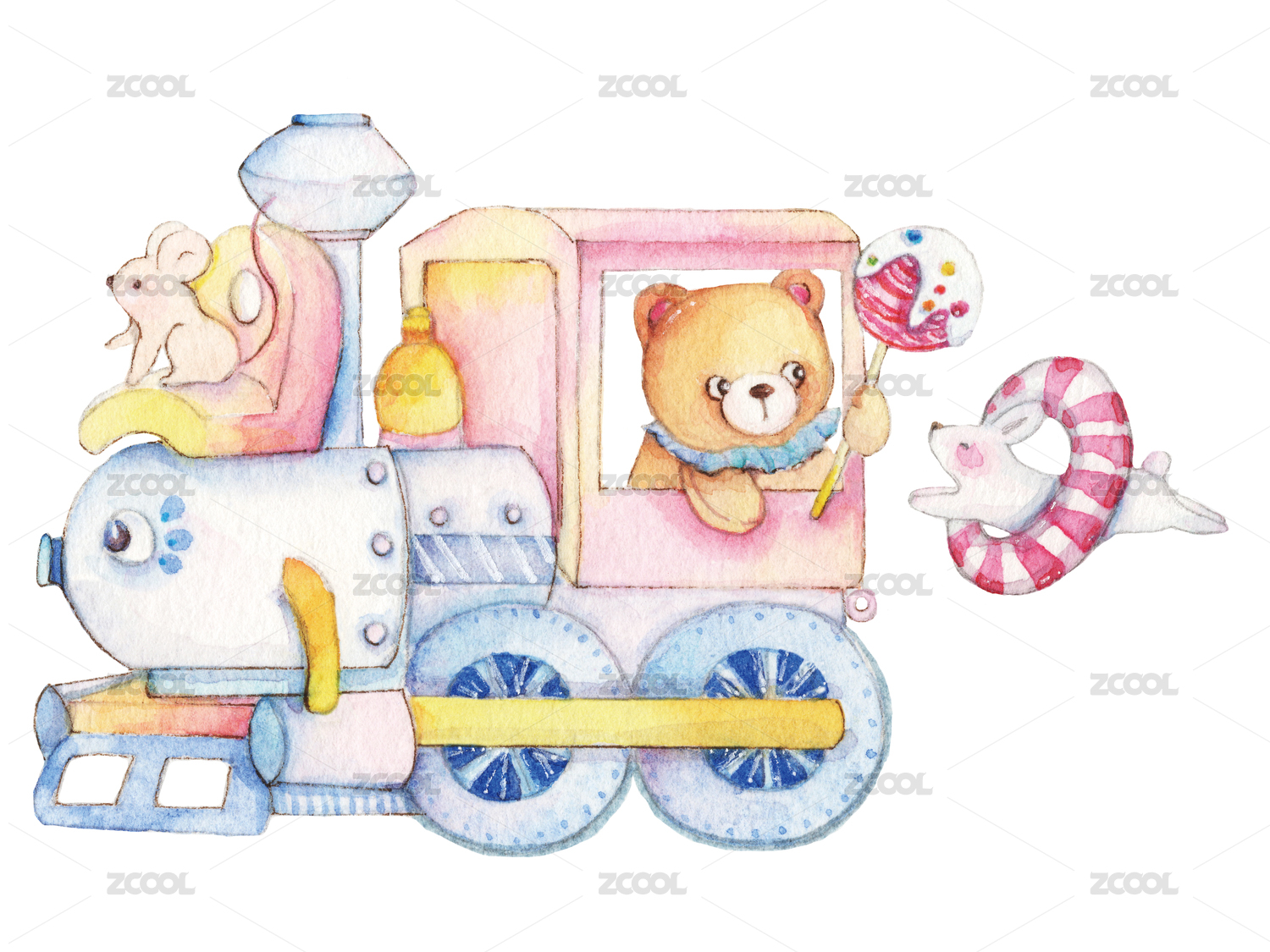 水彩手繪清新卡通可愛(ài)小熊火車(chē)頭玩具車(chē)插圖