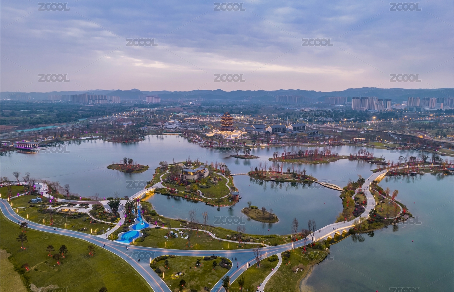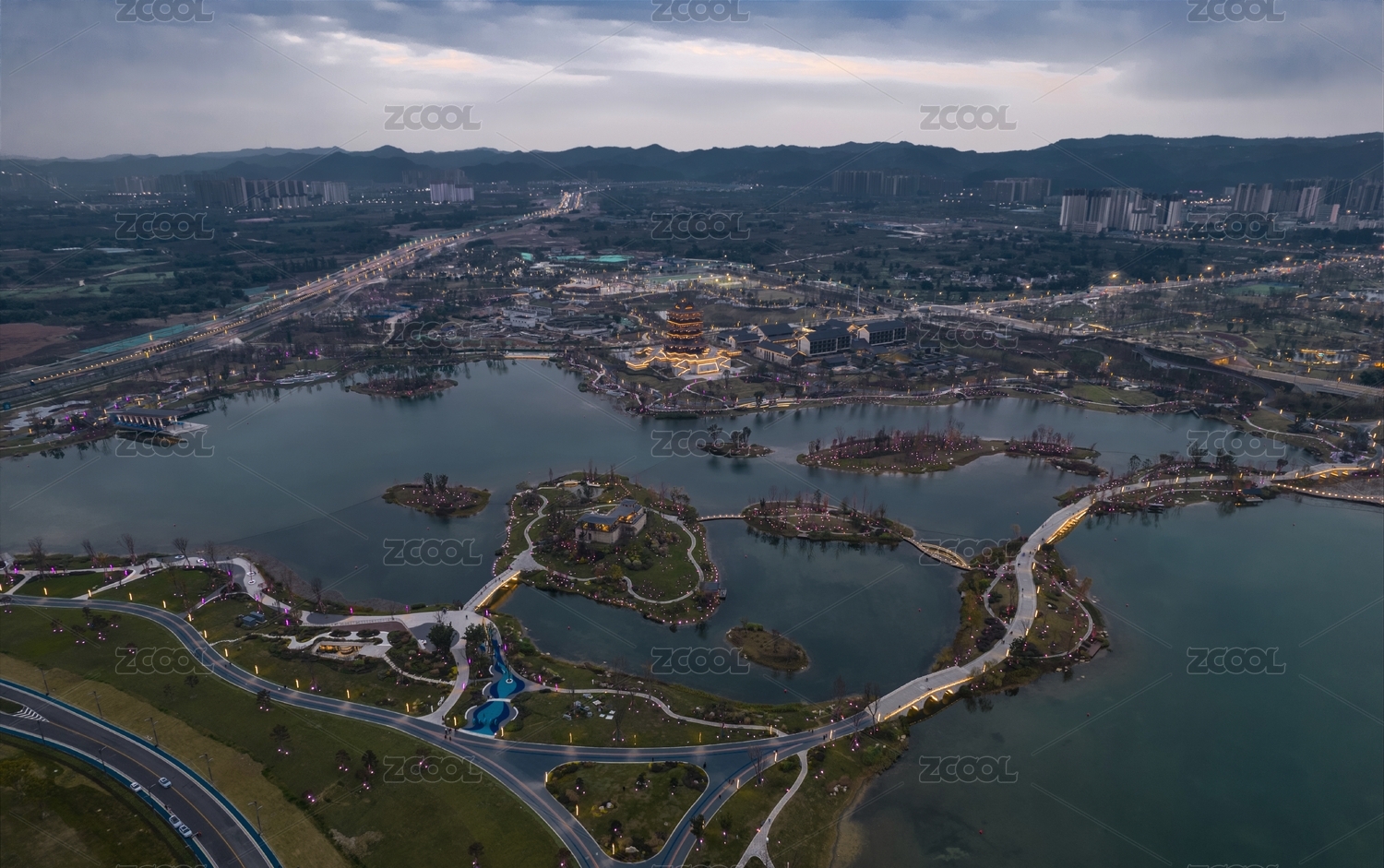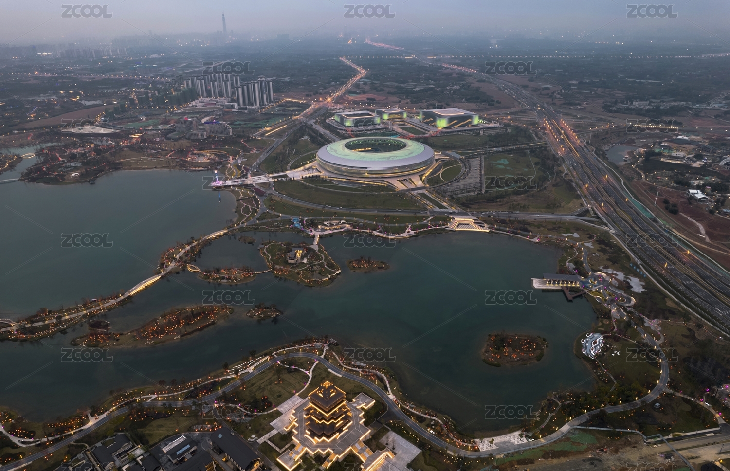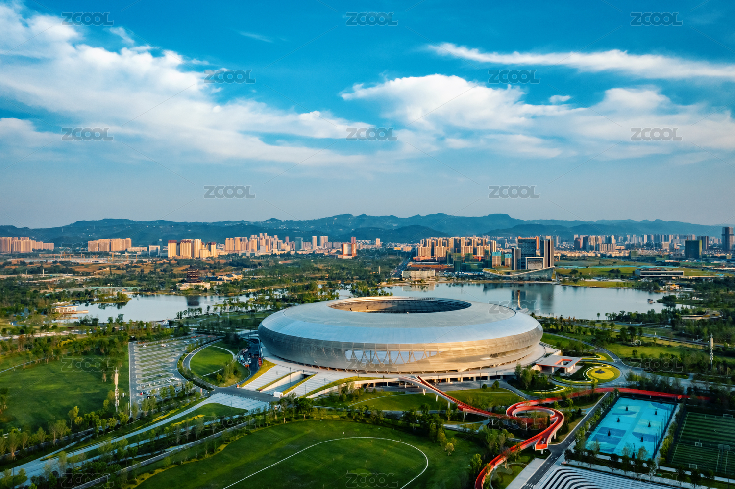 俯瞰成都東安湖大運(yùn)會場館區(qū)的湖泊和建筑